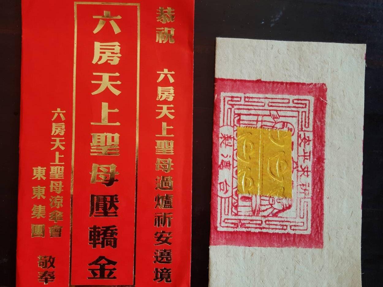 壓轎金是神明鑾轎遶休息時,為了尊敬神明在轎椅上放壽金,讓神明神轎在板凳上暫置,那壽金就是俗稱的「壓轎金」或「墊轎金」。壓轎金有多種功能:保平安、小孩收驚、治病等,由於一般民眾難拿到,索取的人又很多,經常發生神轎一抬離,信眾們便「奮不顧身」搶奪的情形。但壓轎金並非像香火.符令.令旗.令牌那樣正式,一定需要神明同意認可才可以祈請回去,故壓轎金在使用上有一定的程序,才會產生效力。而若有急事須媽祖加持或無法及時到媽祖廟祈祝時,拿著壓轎金向紅壇位置,誠心請求媽祖前來忙,據說非常有用。