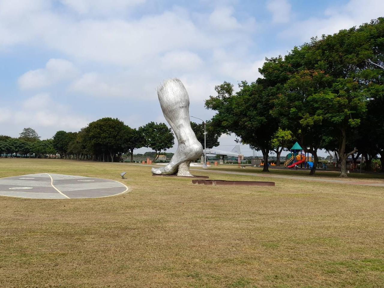 其中最多人打卡的地標就是" 農夫的腳",這個八公尺的裝置藝術作品為「 開拓 ~ 農夫的腳」。表達農夫耕作的辛苦,大腳用力踩在土地上並墊起腳跟,非常有力量 ! 因為它很大,站在旁邊就好像站在一個巨人的腳下,非常有趣味,也增添了公園一些藝術的氣息。