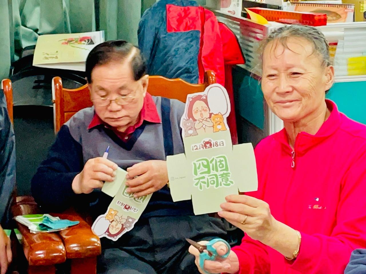 縣黨部青年組陳韻如組長指出,資深黨員自發性的送暖舉措,照映出前輩們一生為台灣民主努力的那份真情,那是對我們共同家園最真摯的愛,大家都積極號召著身邊的朋友一起去投下四個不同意來守護台灣,也提醒所有好朋友不要忘記我們的約定,「12月18日,上午8點到下午4點,一起去投下四個不同意,讓台灣更有力」。 -