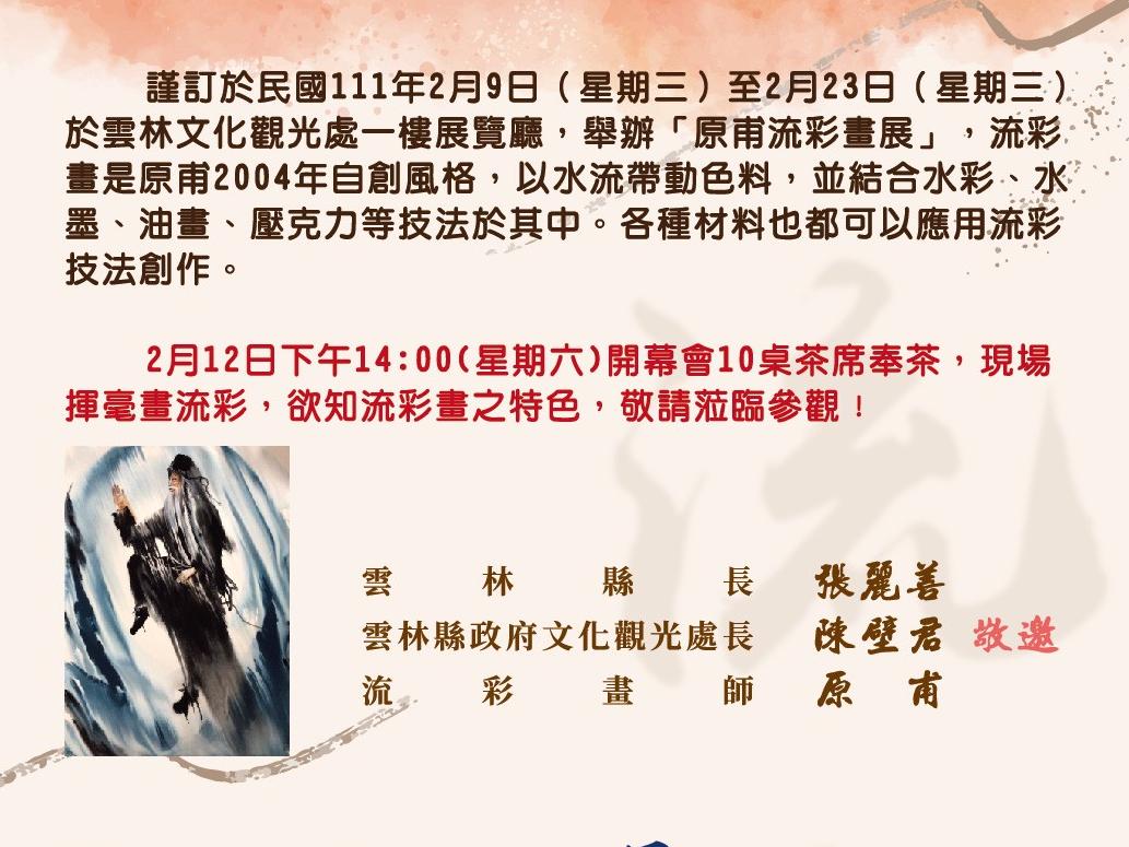 原甫老師現正獲邀在雲林縣文化觀光處(前文化局)一樓舉辦個展,展期自111年2月9日(星期三) ~ 2月23日(星期三)止。