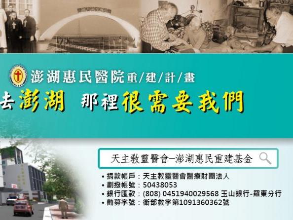 澎湖惠民醫院由天主教靈醫會於1953年由羅德信神父,從義大利遠渡重洋來到貧瘠的澎湖傳道,目睹居居有病無醫師可看之困境,乃秉持著服務病患的理念博愛精神而成立。多年來持續關切並提供弱勢族群之照護。澎湖惠民醫院重建計畫的目的不在於進入新的醫療服務競賽,而是因應著離島長照需求的迫切,資源遠遠不及需求、失智長輩的醫療與照護事工而發起。因為新冠肺炎疫情影響景氣,使得募款更形困難,於是天主教靈醫會大家長呂若瑟神父特別邀請各界好友,一起公開向社會請託,希望大家一起來關心離島長輩、一起幫忙澎湖重建惠民醫院,共同完成這個照護園區的夢想。