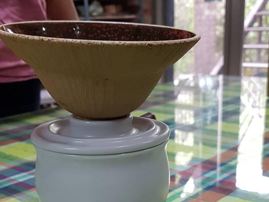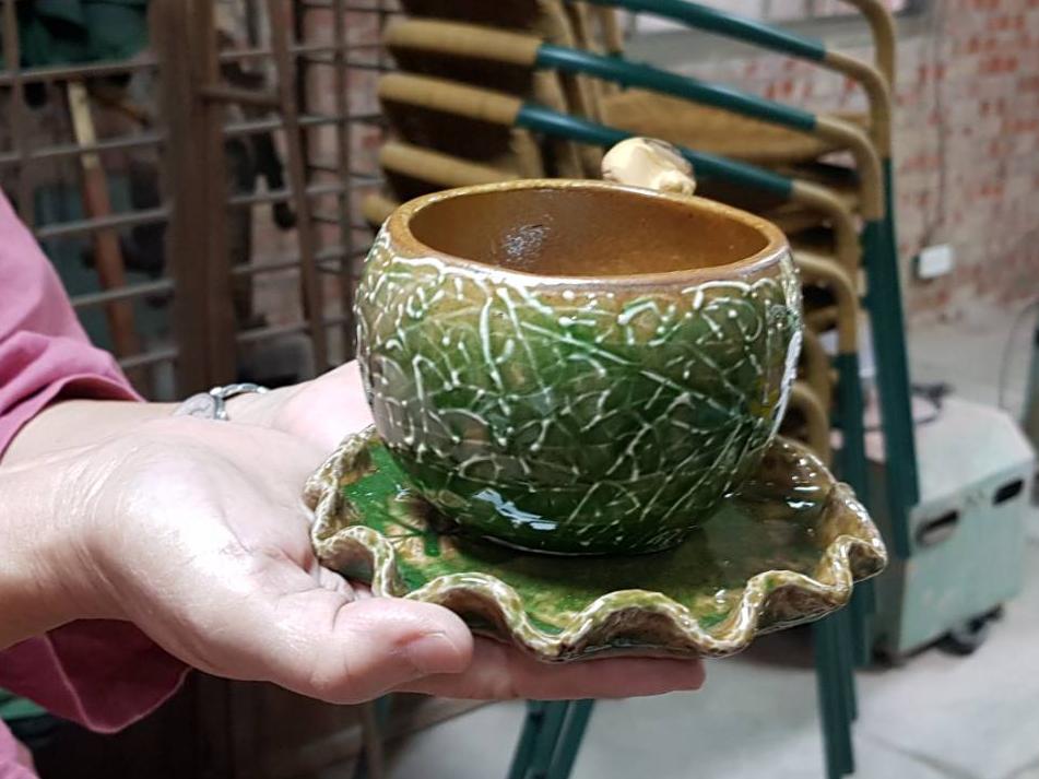 聆聽師母述說,至工作室的學員,老師教授技能,也鼓勵學員腦力激盪,激發出新創意,其選定學員作品都具有觀賞及功能等性質。一個農業特色的穀倉的作品,翻轉成為咖啡過濾的功能;另一個可愛的鬼魂造型,裡面放點燃蠟燭有小夜燈效果。 -