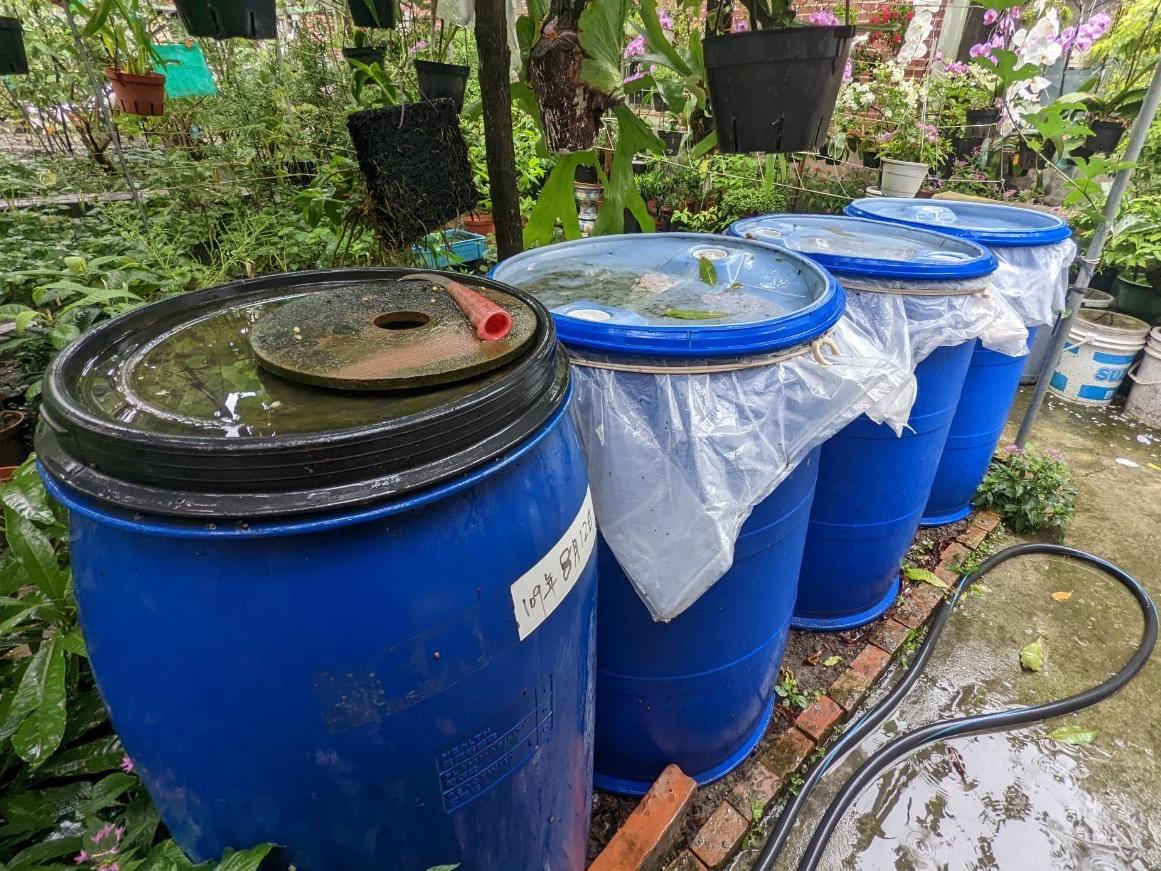三桶藍色塑膠養多種微生物液肥,內含菌根菌、木棉菌、溶磷菌、咕草菌,擴培之液肥,土壤很健康。 -