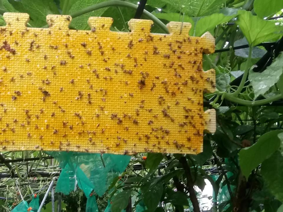 有機果園中最不受歡迎的是果蠅,我用以在塑膠帆布上噴物理性的昆蟲誘黏劑來處理。物理性誘黏劑是在天然黏膠中添加昆蟲喜愛的香料來誘黏有害昆蟲,以達到除蟲的效果。