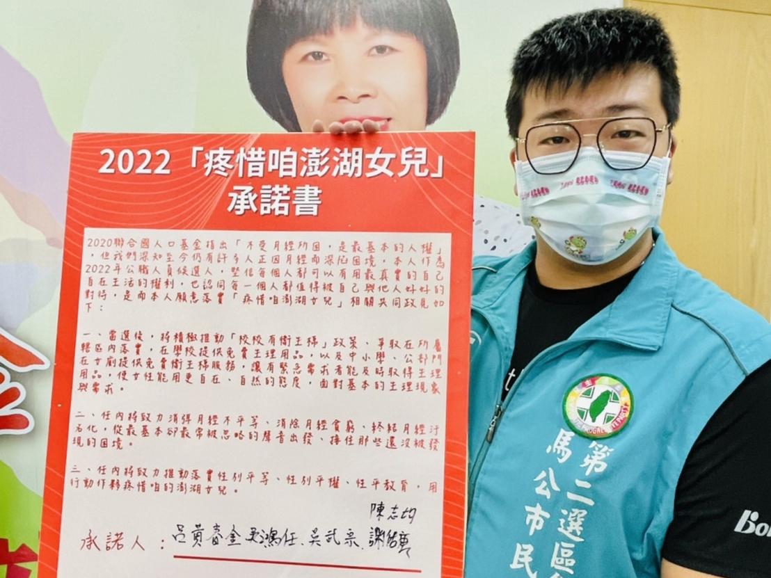 23日上午11時,澎湖正青四位鄉市代表候選人吳鴻任、陳志均、吳武宗、謝佑康齊聚縣議員候選人呂黃春金競選總部,共同簽署《2022「疼惜咱澎湖女兒」承諾書》,承諾當選後將積極推動「校校有衛生棉」政策、爭取在所屬轄區內落實,並與在地婦女團體一同舉行客廳會,暢談性別平權政策。