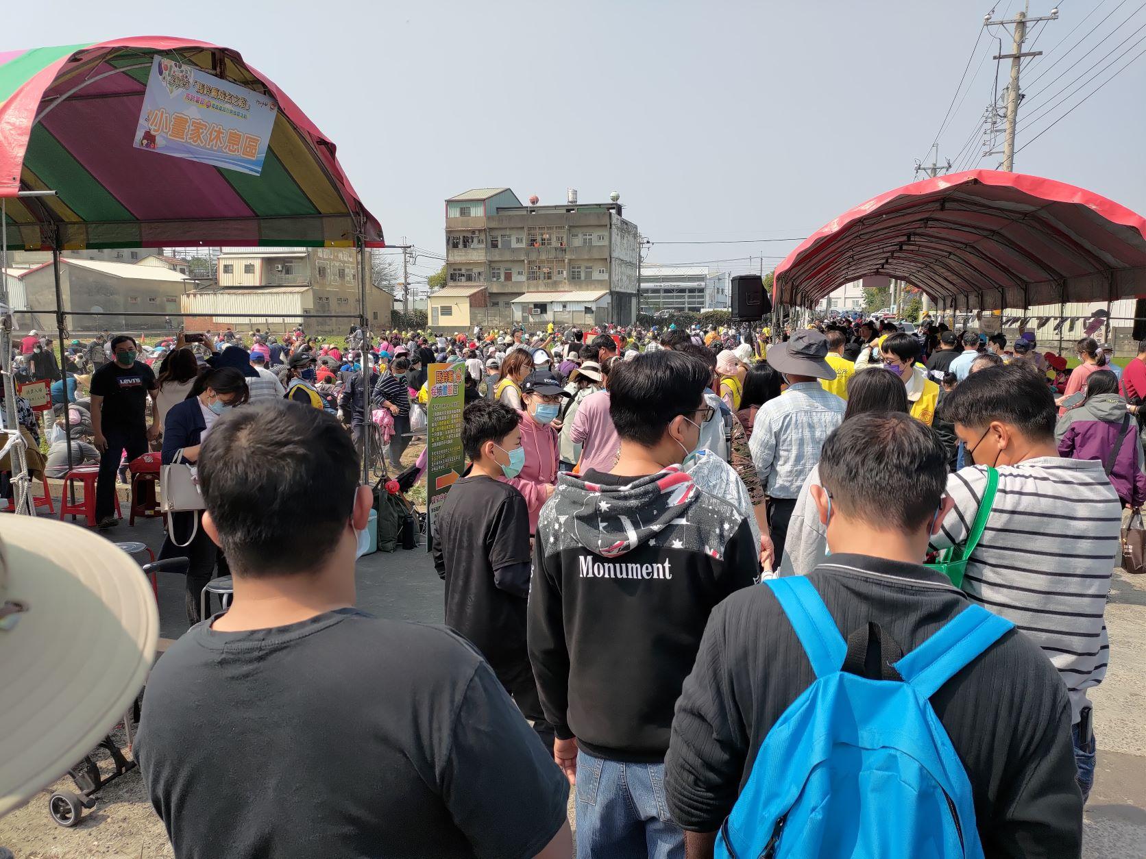 排隊人潮滿滿滿,前方民眾已採好馬鈴薯,後方民眾還在排隊鄰近居民聽說今天可體驗採馬鈴薯,早早就有許多民眾自備椅子,兌換活動開始就換好體驗卷與袋子,在田區入口處等待,隨時準備進田裡採收馬鈴薯 -