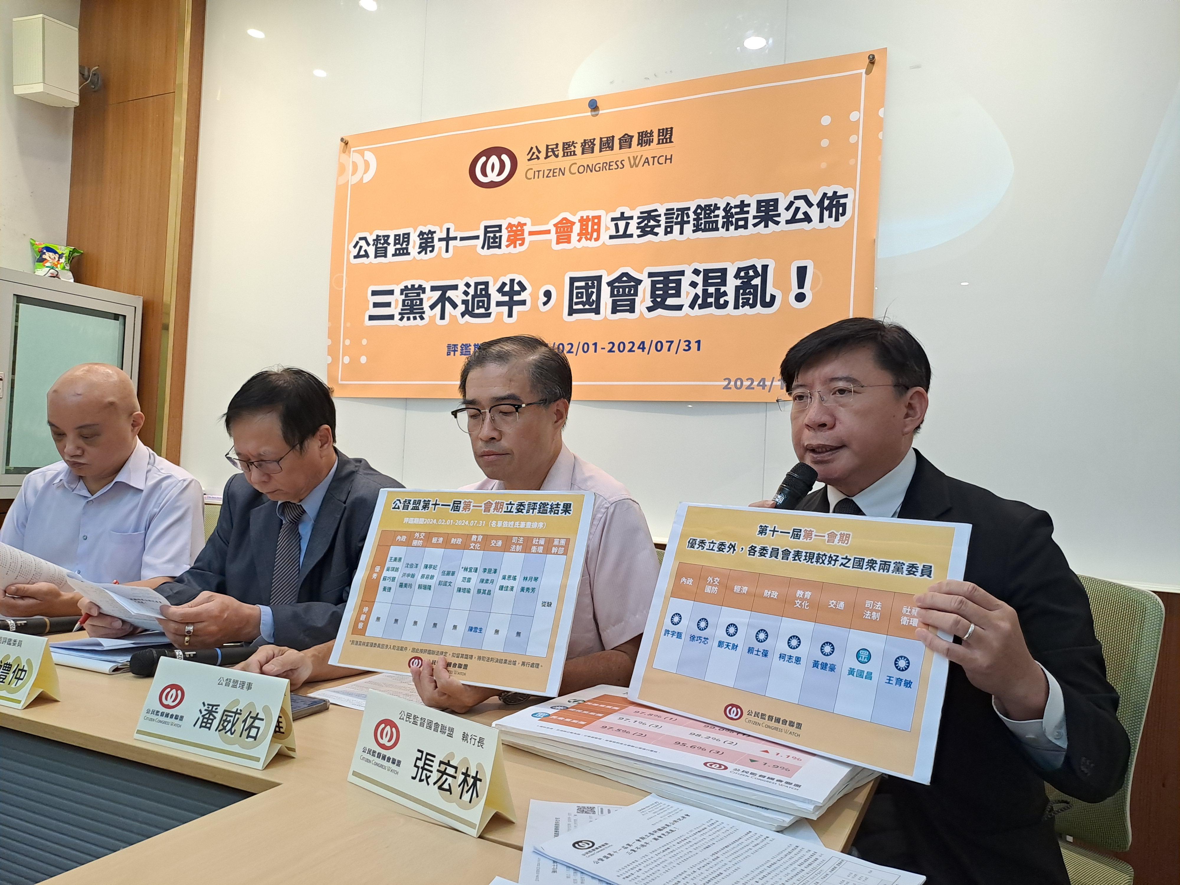 公督盟執行長張宏林表示:「本屆國會是我國立委席次減半過後,首次在立法院席次上面對三黨不過半的局勢,大家都期待新國會能有新氣象!並能創造出更多政策討論的空間,但從結果論來說,民眾黨並未發揮出第三勢力的關鍵角色,從公督盟立委評鑑結果上來說,也和過去進步小黨表現優於兩大黨的情況有所不同,本會期民眾黨的整體表現和上屆相比是呈現下滑趨勢;而立院政治上依舊是兩大政治集團的分立對抗!在本會期爆發多起激烈肢體衝突,最終導致十萬公民上街包圍立院抗議!顯然新國會第一會期的成績單,人民是有所失望的!」