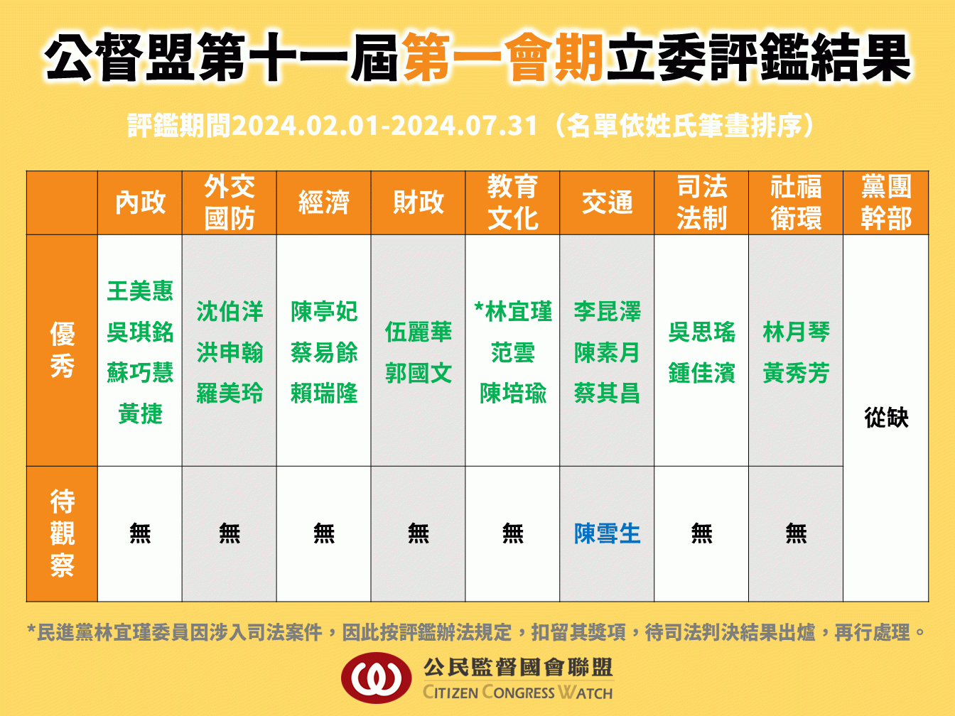 公民監督國會聯盟(公督盟)長期致力於推動國會改革和透明化,自2007年成立以來,就持續藉由立委評鑑監督國會議員表現,至今已經持續17年,總共累積33次立委評鑑的經驗,是我國立委評鑑的第一品牌,同時也是國內唯一評比待觀察立委的民間團體;另外,公督盟的立委評鑑作業流程相當嚴謹,分為初審和複審兩階段,前後歷時半年,經4場評鑑諮詢會議、1場立委評鑑說明會,以及22場初審會議討論,並有1948人次參與公民評鑑,最終在9月22日複審大會中,依初審小組的審查報告議決出22位優秀立委,優秀黨團幹部則從缺,至於待觀察立委,則為國民黨的陳雪生委員。