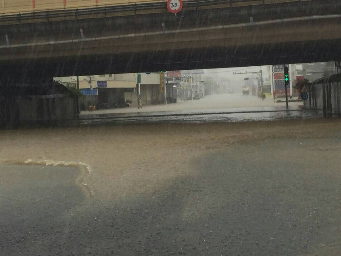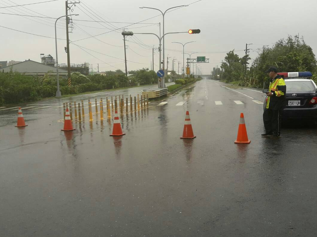 台南市麻豆、善化之間的麻善大橋廿八日早上因低漥處積水,警方封鎖大橋。