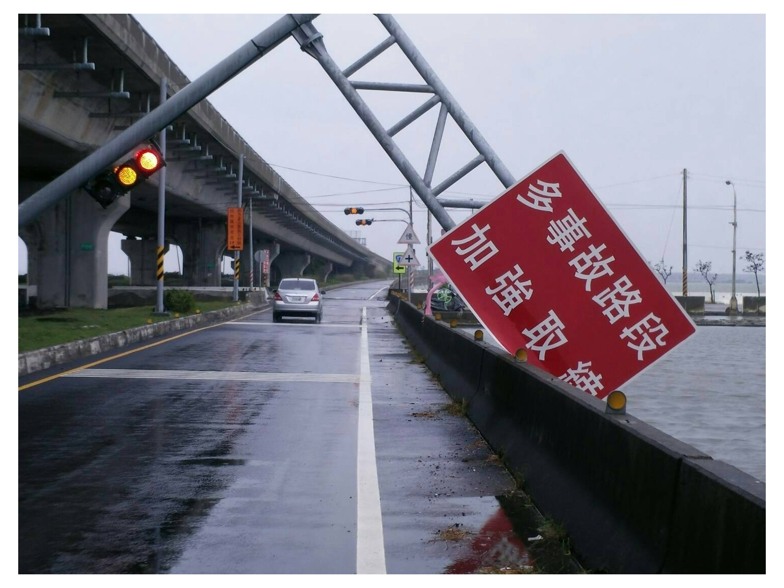 一夜強風豪雨,台南市路樹被吹倒的數目難以估算,學甲區一七三線道路標誌不禁強風應聲倒下來橫在路面上,幸未釀災,另外,麻豆與善化之間重要橋樑麻善大橋,廿八日早上因大雨導致低漥處積水無法通行,警方在早上十點拉封鎖線禁止人車誤闖發生意外。
