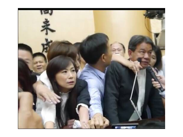 一波三折的台南市議長選舉,三日上午藍、綠兩黨仍動員攻防,代理議長的副議長郭信良(右一)一路被擠上主席台。