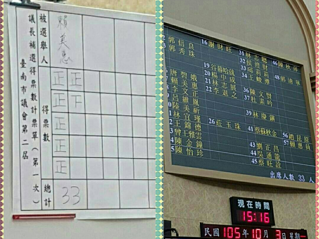 10月3日下午2點台南市議會進行議長補選民進黨推出的議長候選人賴美惠獲得出席33位議員的全數支持,以33票順利當選。