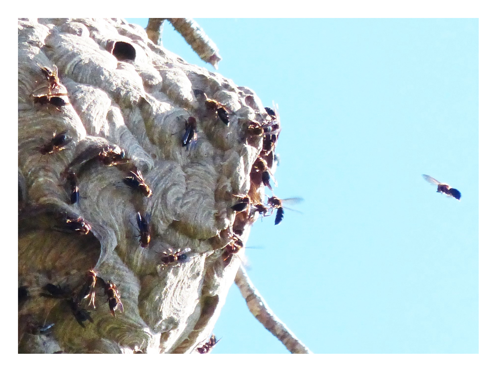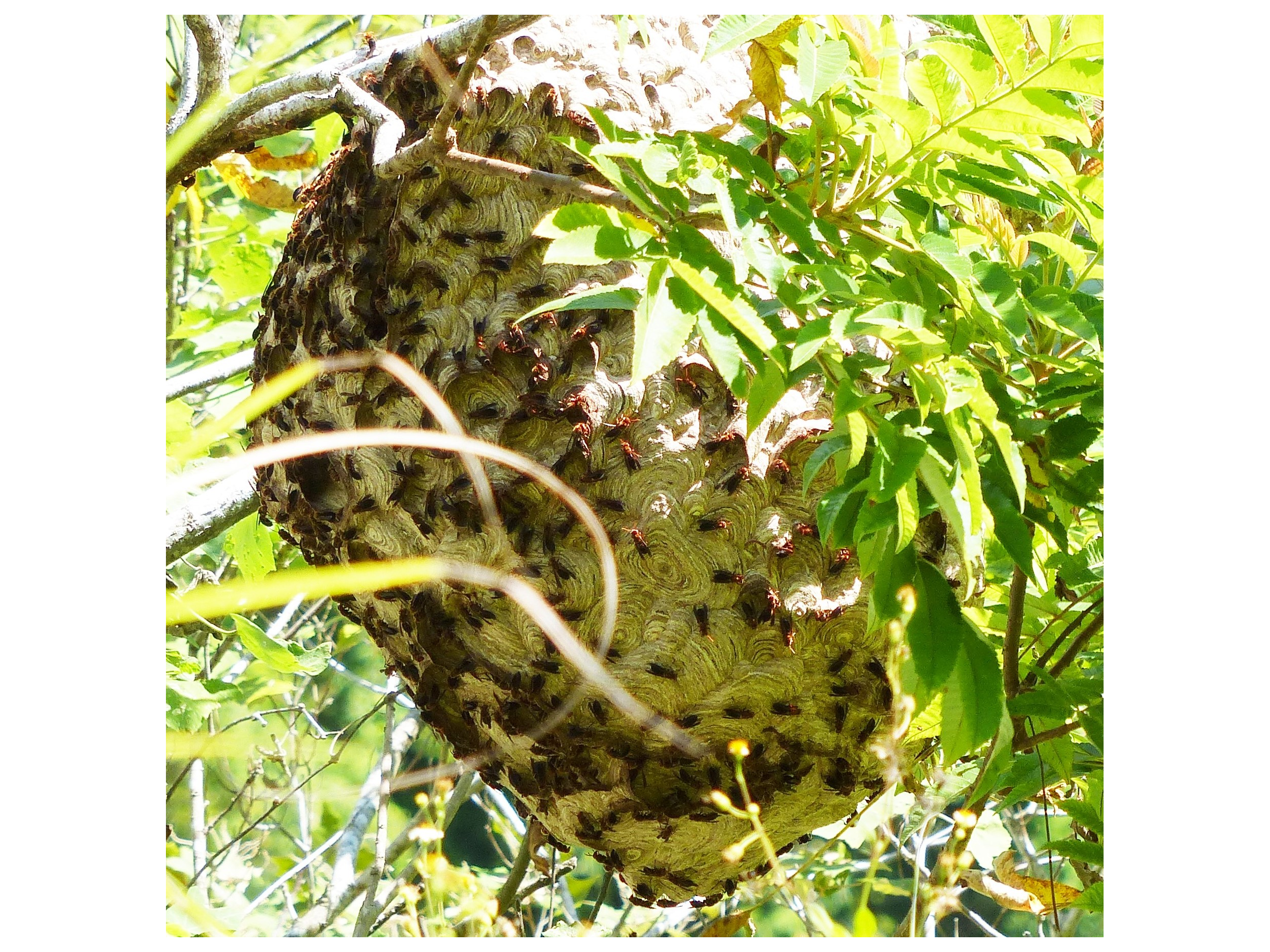 這個築在路邊的黑腹虎頭蜂巢,此蜂俗稱雞籠蜂,是最凶最猛的虎頭蜂,在花蓮縣富里鄉有螫死過水牛的記錄。 -