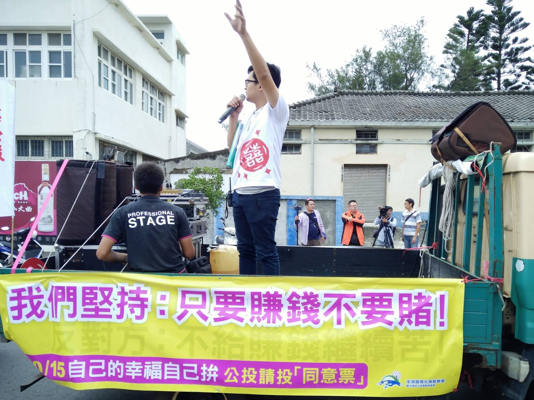本遊行於下午兩點三十分於觀音亭前集合,三點出發。遊行前,宣傳車上發言人宣稱:「澎湖人的未來,澎湖人自己決定。(通過博奕後)不用擔心醫療、生態、冬天風大沒錢賺,不用擔心打零工」「我們澎湖人不要賭博,只要賺錢!」「請在10月15號用你手中的一票,為自己的未來鋪路,為孩子的未來鋪路!」活動於四點左右抵達文德路的澎湖喜事館告終。