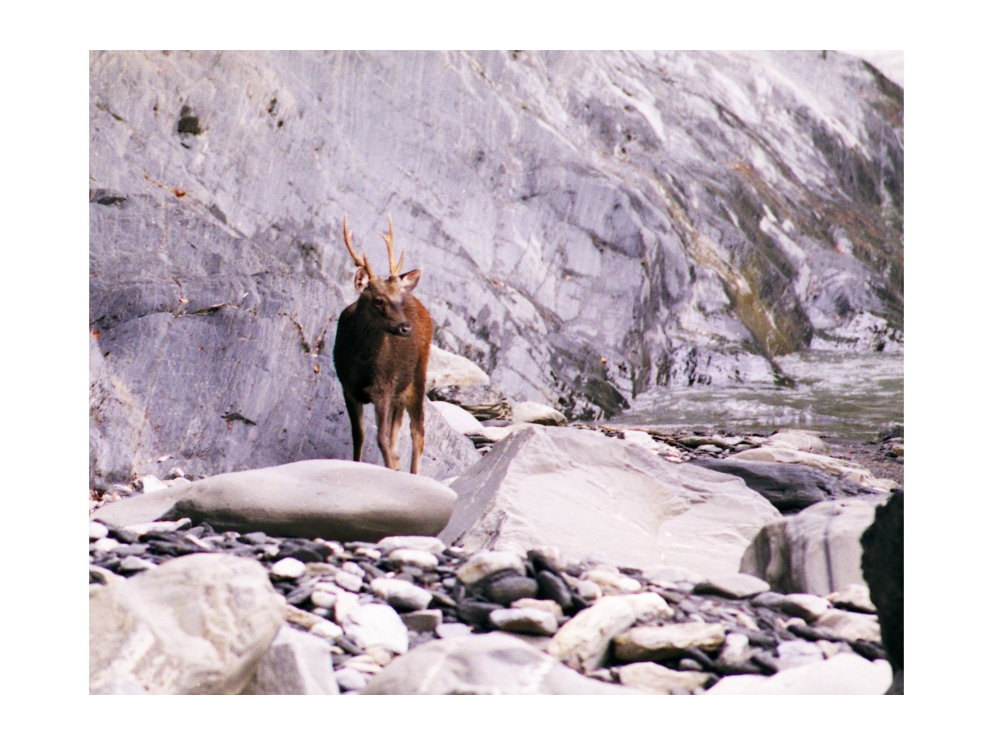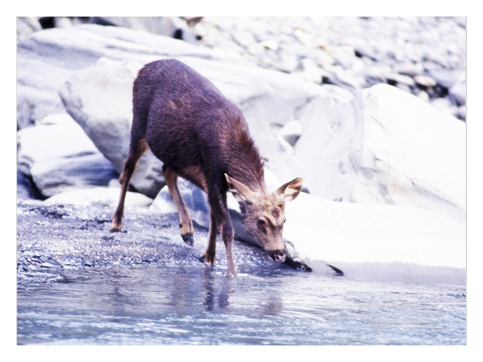 玉山國家公園大分山區的水鹿,正在溪邊準備喝水。(鍾榮鋒攝)