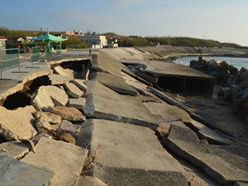 熱心村民表示:「颱風時,海浪衝擊的方向來自西南方,海堤右方的崩垮就是因為長期直接承受海浪衝擊的結果,所以我們同意改善工程中,以塊石延長西南方離岸突堤,並新設導航標誌燈,因為這裡是需要減緩海浪衝擊力的關鍵點。」