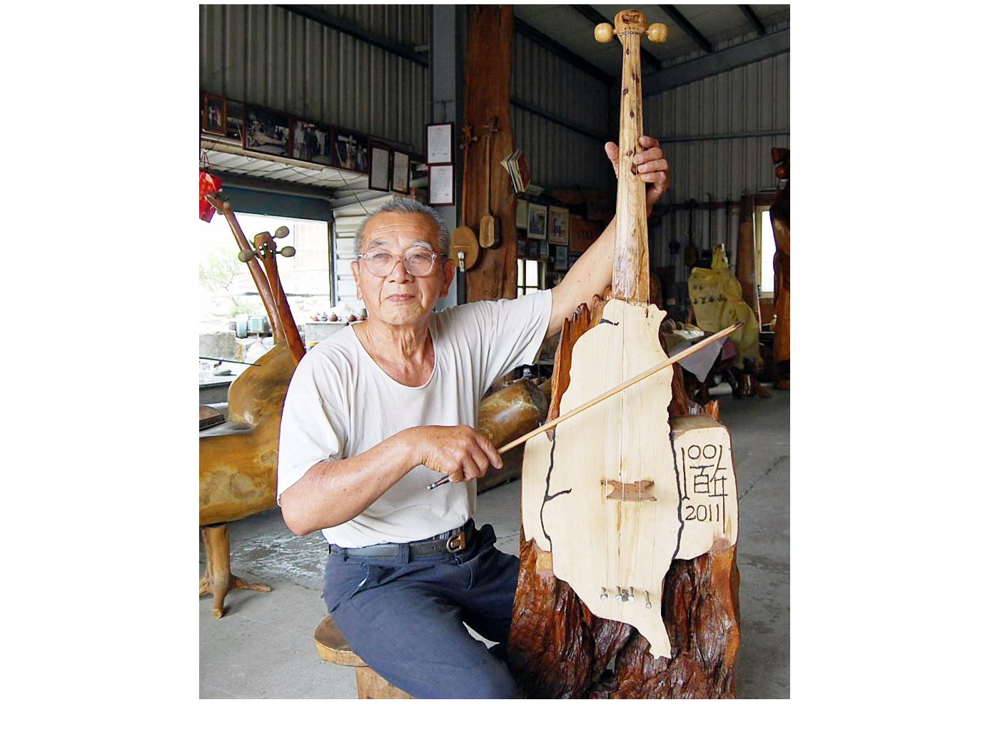 農機維修師傅花龍雄巧手打造樂器,2011年利用斷木打造台灣造型的提琴。