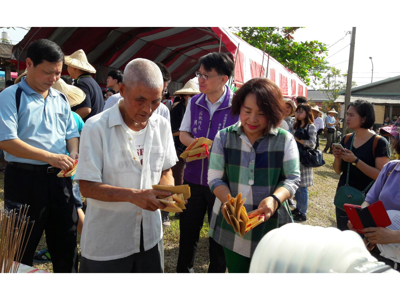 崑濱伯(左二)與台南市議長賴美惠(左三)在收割前,拜拜燒金紙敬天,感謝老天爺賜糧食。 -