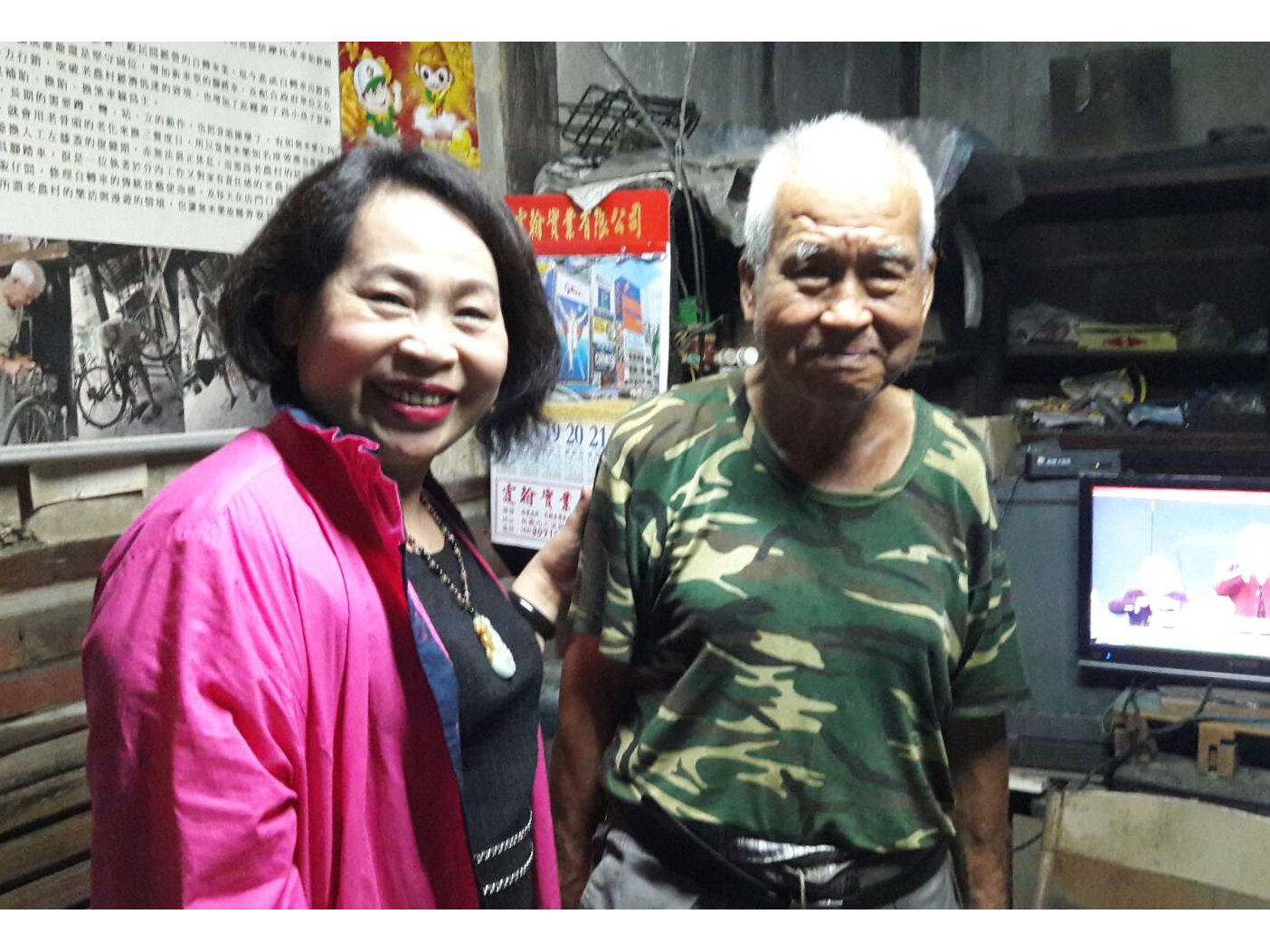 85歲老店長黃協成(右)守著近百年老店,台南市議長賴美惠趁活動找黃店長聊天。