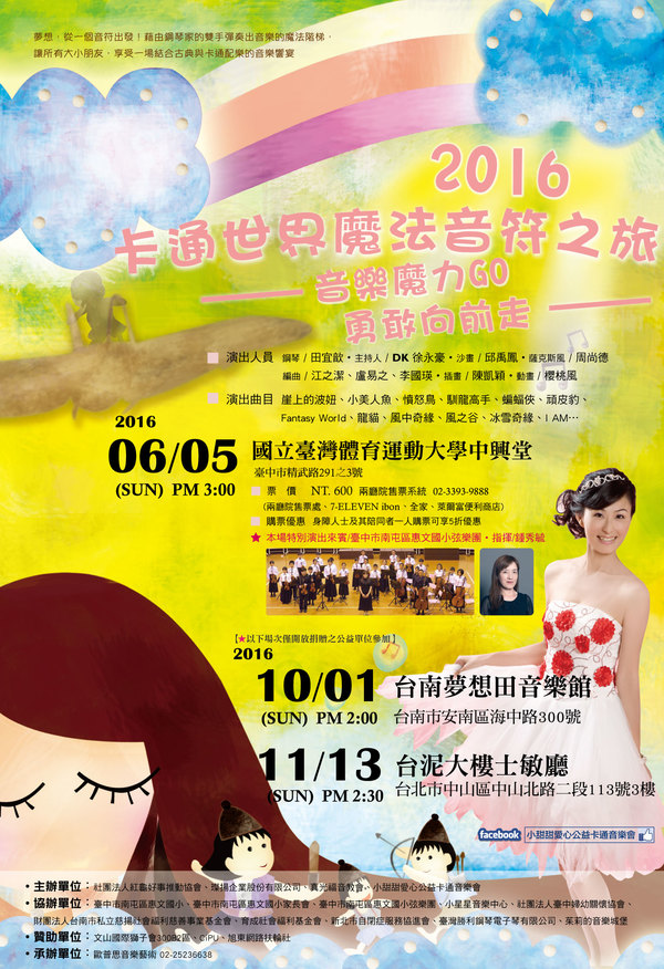 全台巡演滿6年的,演出超過30場的「卡通音樂魔法音符之旅」,在年底都有一場純公益音樂會,音樂會發起人田宜歆老師一路以來秉持公益精神–音樂感動人心,人人享受音樂帶來的美好感動,激發正面力量,以古典音樂結合卡通元素創意演出,盼望帶給孩子們更多快樂感受。