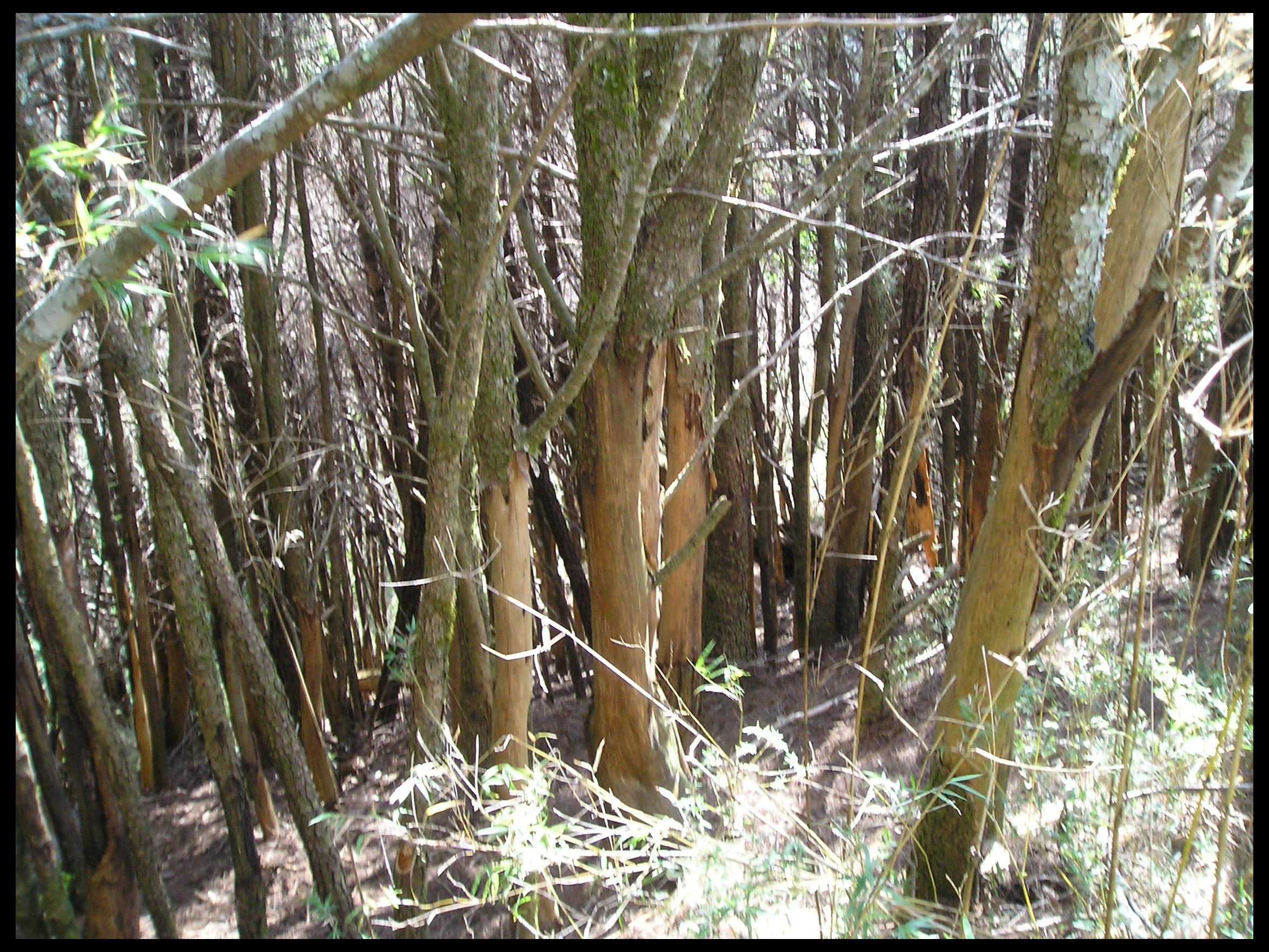 玉山國家公園二千公尺以上園區,鐵杉林樹皮被鹿啃食,磨皮磨破,學界有一派擔心,鹿會像台灣獼猴為農作般為害森林。(林淵源攝) -