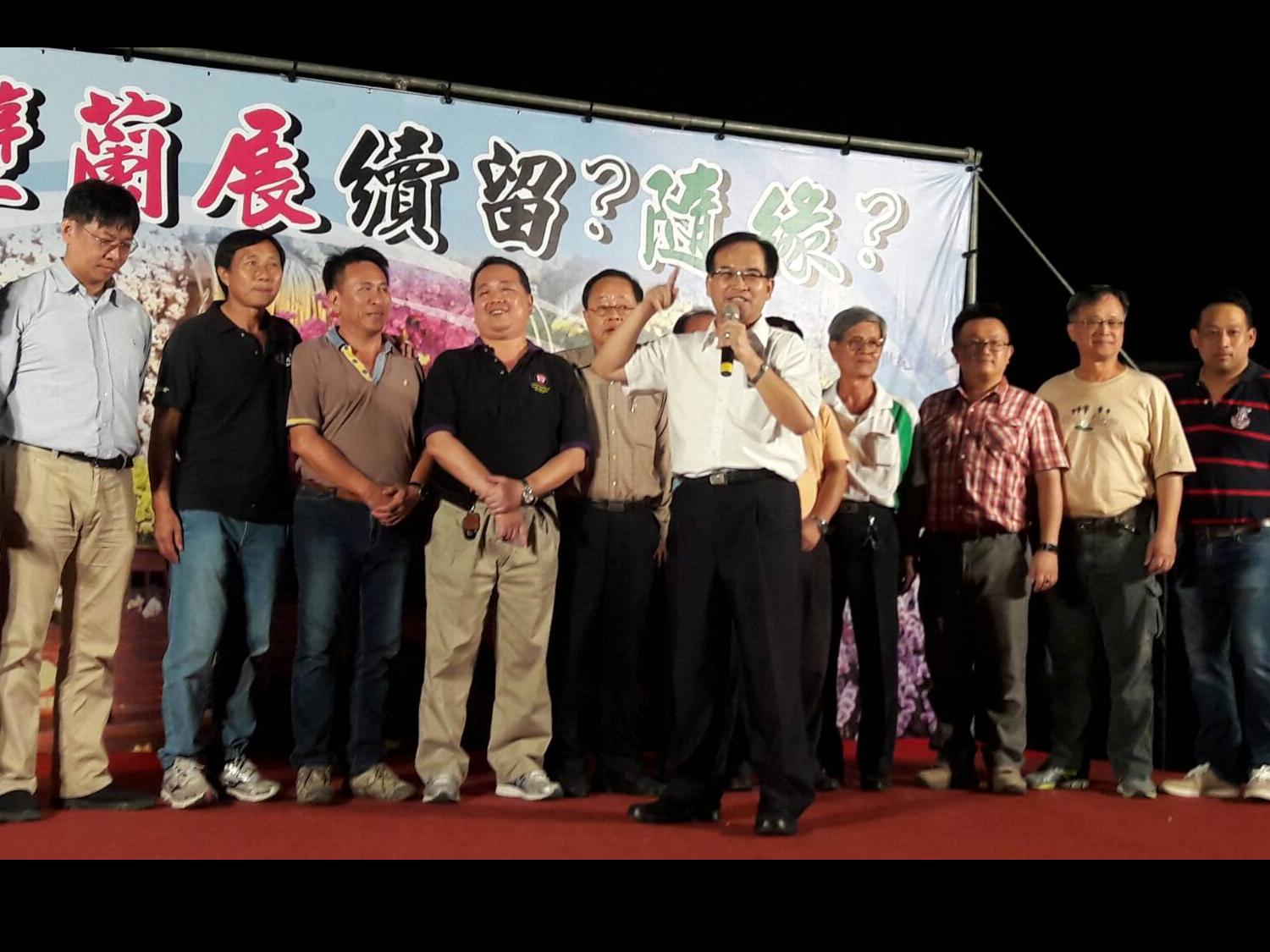 蘇煥智(持麥者)率蘭花園區業者,一起表達不願蘭展移出園區。 -