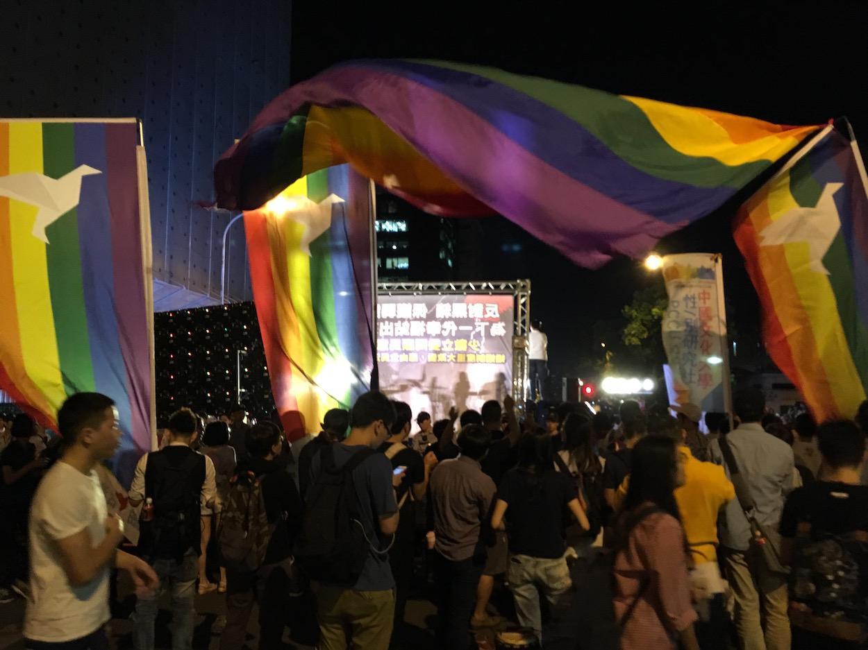 The number of pro-marriage equality demonstrators grew as night approached, presumably because work had ended for many, growing to several hundred. The pro-marriage equality Christian group held a candlelight vigil during this time. Third Force parties such as the New Power Party and Free Taiwan Party made appearances carrying rainbow banners, with Freddy Lim and Kawlo Iyun of the New Power Party giving speeches, and the Free Taiwan Party bringing large rainbow banners to the demonstration site. Anti-marriage equality groups later would lash out at Lim for his speech, continuing claims circulated during 2016 election season by Lim’s political opponents that Lim was a sexual deviant for having long hair.