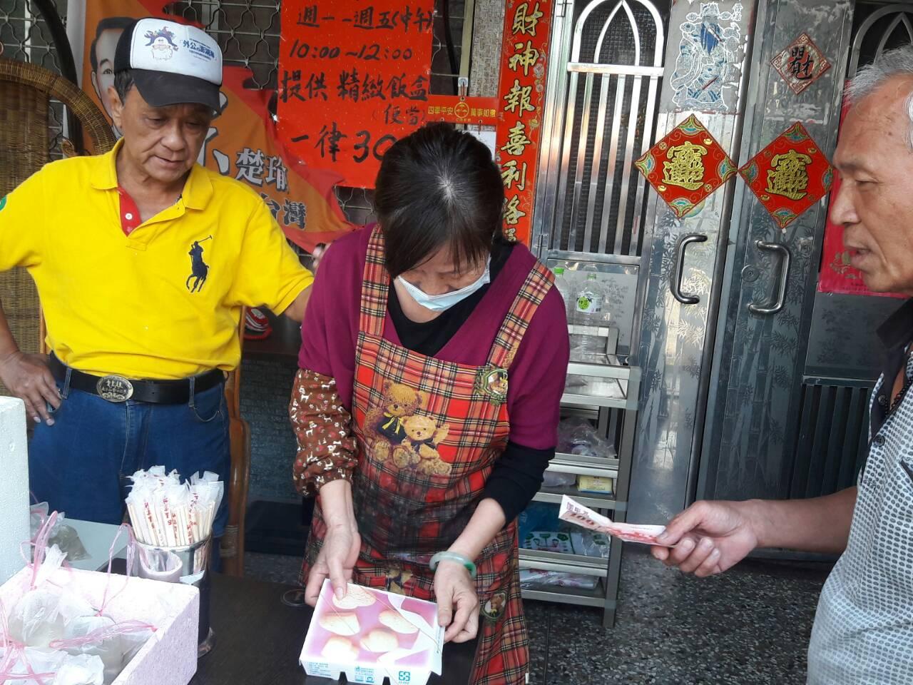 施義川(左)在家門口賣30元愛心便當,引人搶購。 -