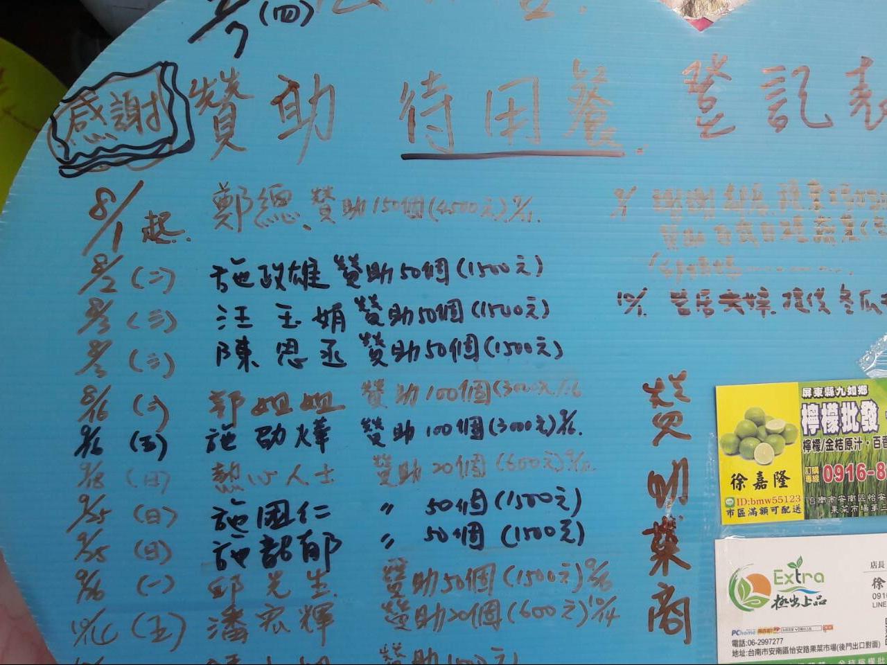「快半年了!兒子不讓我閒閒沒事做,雇人煮飯、炒菜,打包便當,讓我在家門前販賣」施義川說,30元便當不要說賺錢,不虧本都很難,但能夠照顧弱勢族群也就好了。施義川的兒子施紹宏在永康區開小工廠,發揮愛心從半年前起販賣愛心便當,吸引不少菜、肉、魚攤販加入行善,捐錢或捐蔬果魚肉,減低成本壓力。也有人捐「待用餐」,低收入戶沒錢吃飯,可以直接到這裡來拿。事實上,許多獨居老人家不喜動鍋鏟,直接到這裡解決三餐問題,省了很多力氣,30元便當對正發育的小孩嫌太小,老人家卻剛剛好,因此很受歡迎。