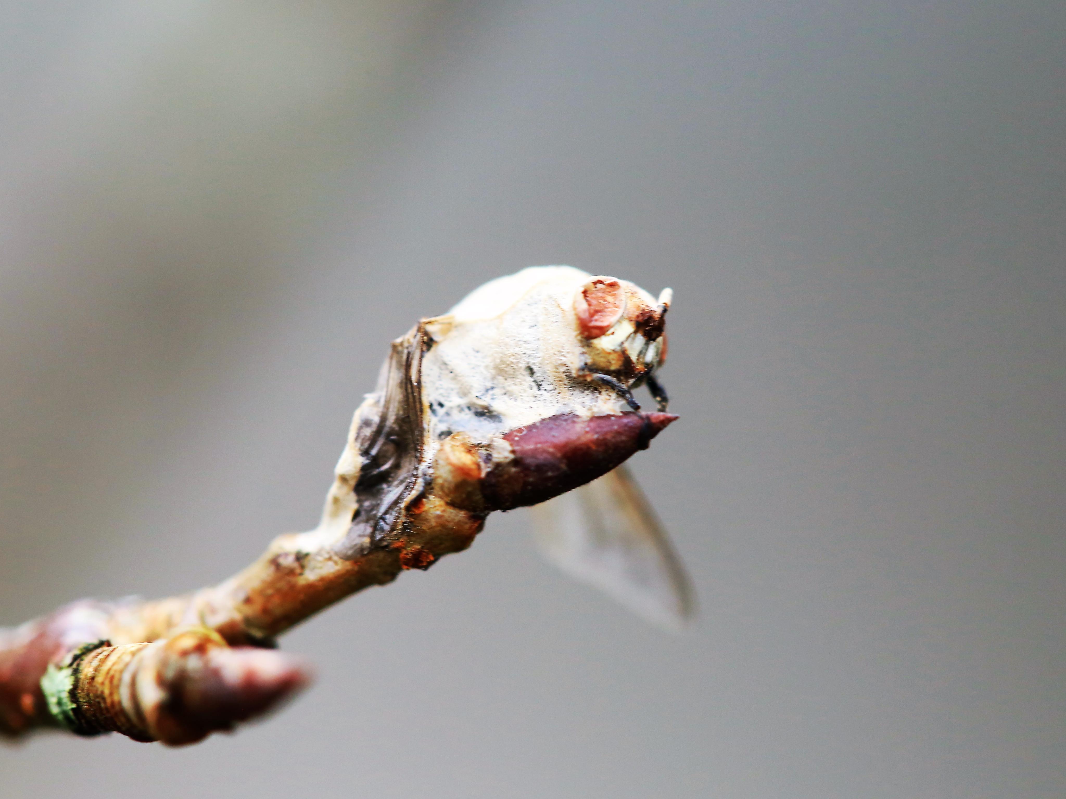 玉里鎮源城里有農民發現,他家門前一棵野櫻,葉子已落盡,等著開花和春天來臨,但樹光禿枝條上,掛著許多死亡肉蠅。