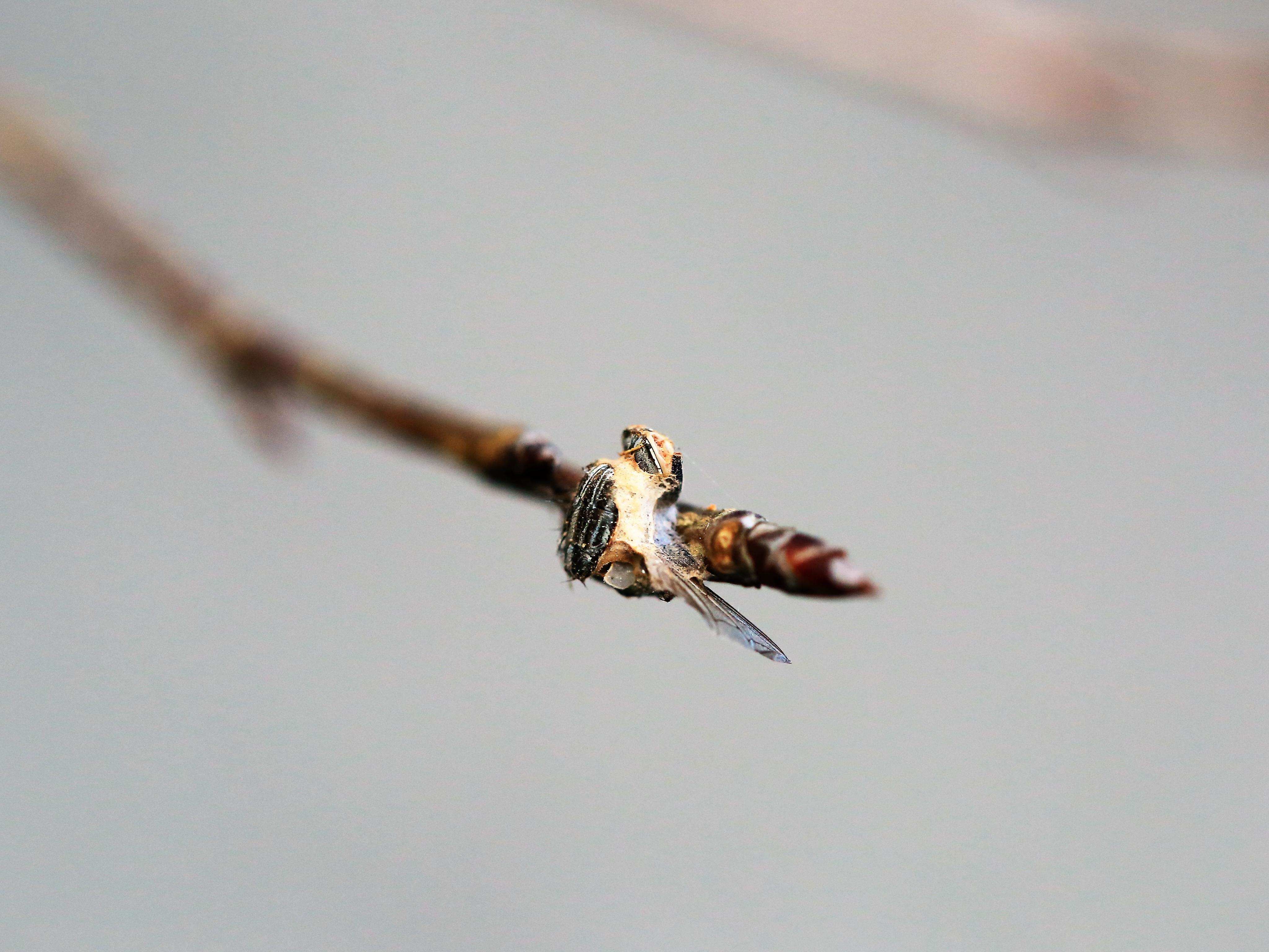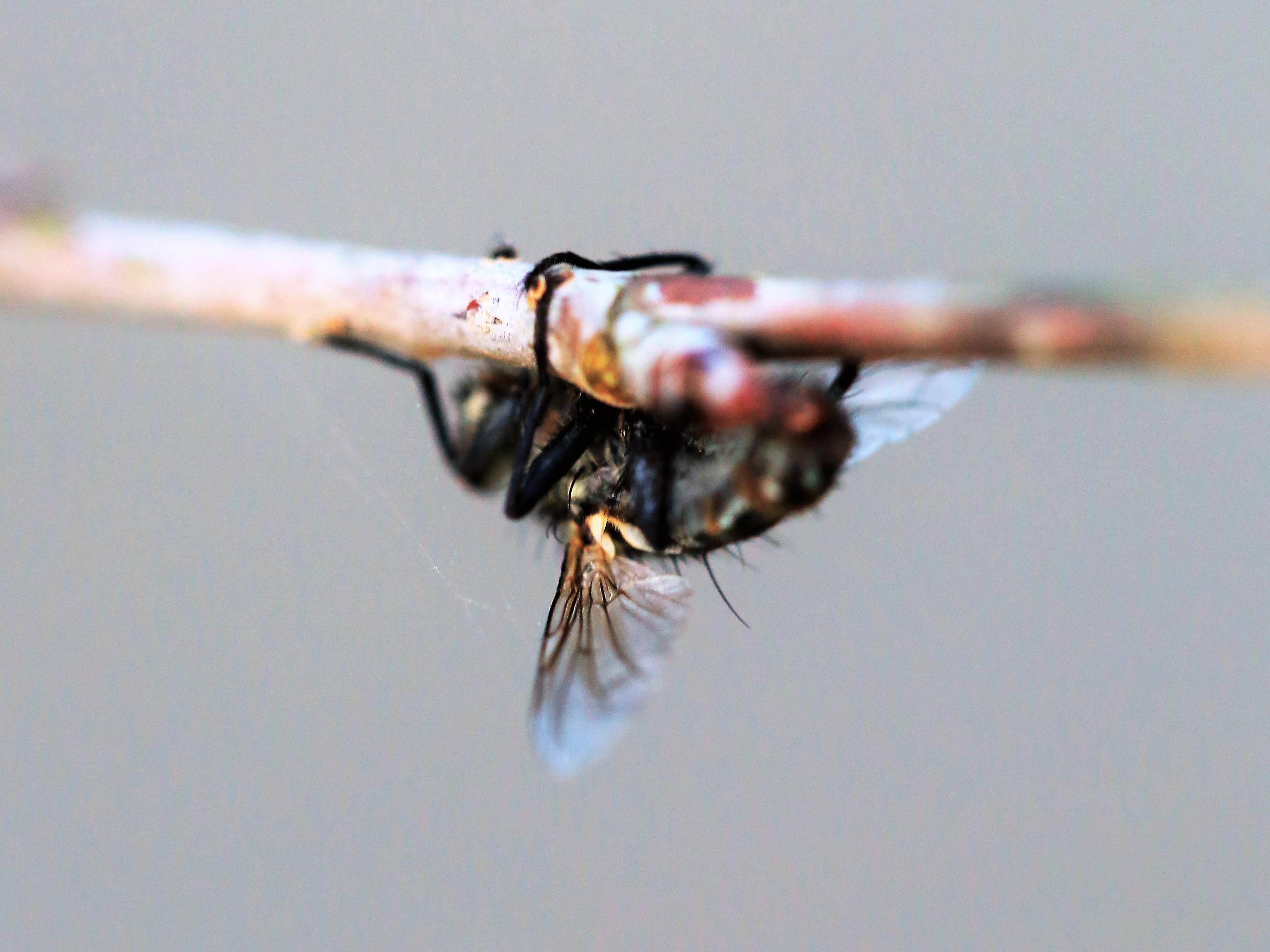 這些肉蠅有的剛飛來,緊抱枝條末端,死去不久;有的死去後,好像被蜘蛛最後利用,用蛛絲綑住,吸盡牠的體汁,成為木乃伊,掛在枝條上。