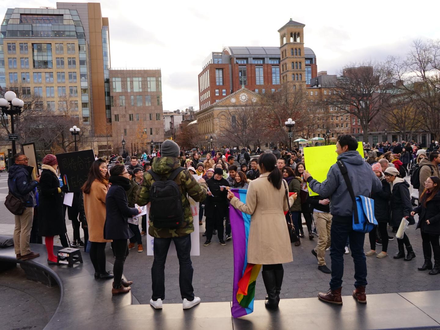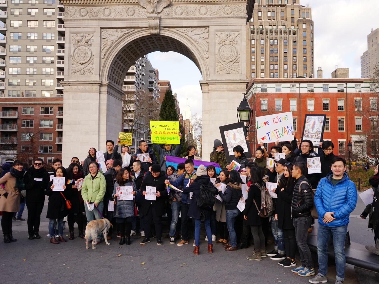 因為不滿台灣執政黨在修正民法將同志婚姻合法化的態度反覆和對抗反同婚團體對同性戀族群的污名化,由「海外台灣青年陣線聯盟/ 海台青紐約支部--Island X」發起的「海外台灣人支持修正民法,力挺婚姻平權」全球串連活動,紐約場於星期六在華盛頓廣場公園集會,聲援台灣同性婚姻合法化的運動。共有近百位留學生,台僑和西方人聚集在公園的凱選門前高舉彩虹旗和自製的支持台灣婚姻平權的標語,並開放民眾在All Rights for ALL海報上簽名,也發送有台灣形狀的彩虹紋身貼紙。華盛頓廣場公園向來是紐約民權運動一個重要的據點之一,許多當地人和遊客被活動吸引而駐足了解原委。活動主持人在簡短演說中對民進黨政府在民法972條修法的態度從選前的承諾到現在的無動作提出質疑,要求民進黨「踹共」。