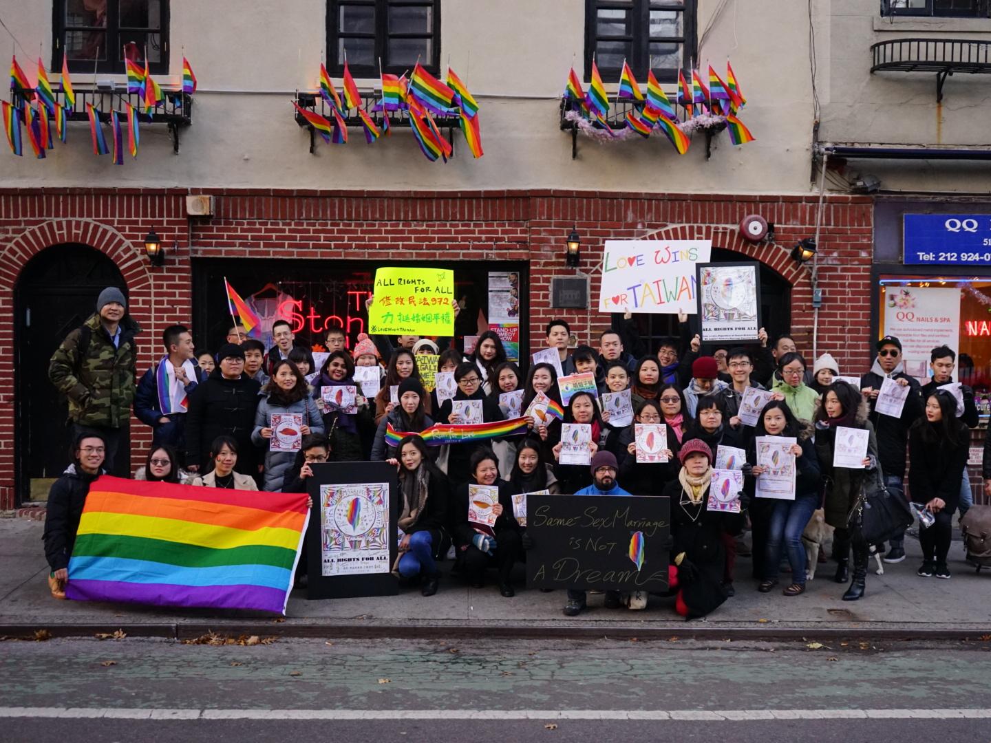 「海外台灣人支持修正民法,力挺婚姻平權」全球串連活動紐約場吸引近百位在紐約台灣人參加。集會人士在高喊「民進黨踹共,別當護家盟」,「婚姻平權,基本人權」,「專法就是歧視,平權要修民法」口號後,一行人舉著彩虹旗並高喊「Hey-Hey, Ho-Ho, Homophobia's Got to Go!」「LGBT, We Demand Equality」、從華盛頓廣場公園步行到格林威治村美國同志平權運動發源地的「石牆酒吧 (The Stonewall Inn)」前,再度提出要求民進黨履行支持婚姻平權的訴求並喊同志平權等口號後結束一個多小時的聲援活動。 -