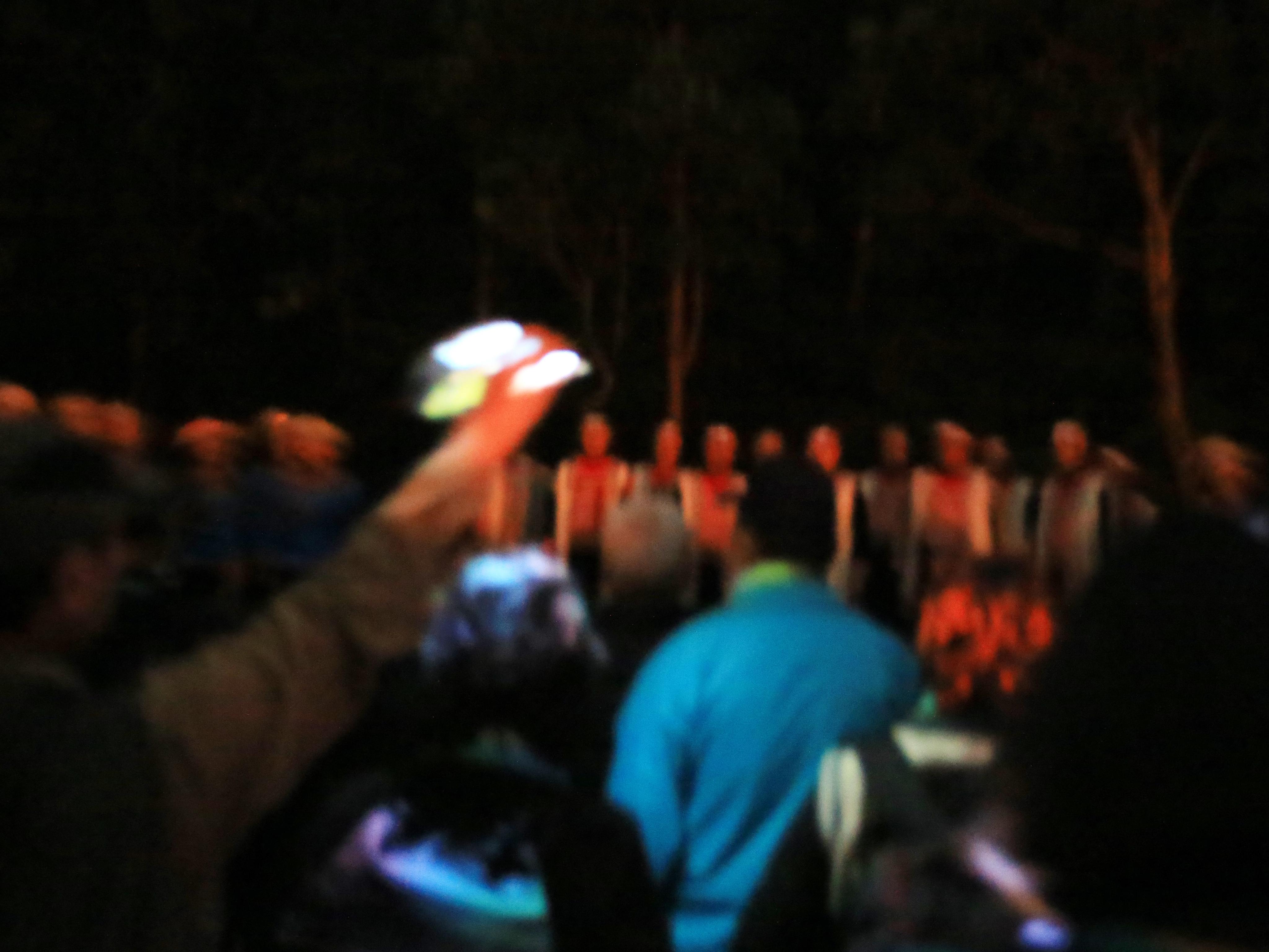 晚間六點,天色完全暗下來,八通關越道上的山風平台,山風徐來,沒有燈,看不到火,只有微弱天光;平台上,人影晃動,天籟從人影中傳出。卓溪鄉布農族瑪思靈樂團,在「暗嘸嘸」的空間,演唱布農族傳統謠樂,從童謠唱到古調,布農族精華樂章,都在暗夜山中傳出。震憾一群外來學者、音樂人和遊客。
