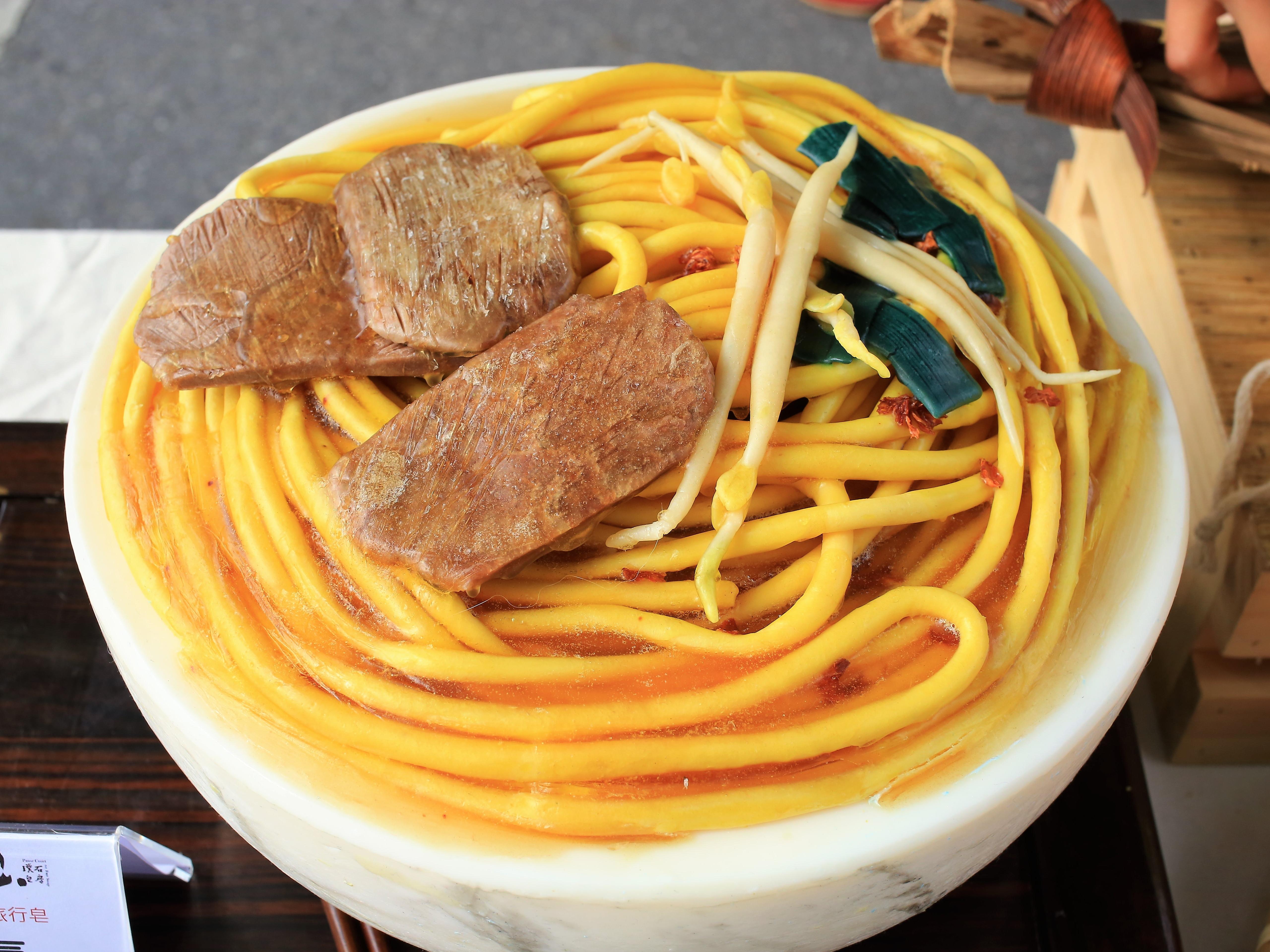 在玉里鎮開班教人做手工皂的梁姓老師,最近配合官方舉辦的泉麵節(花蓮溫泉季、玉里麵節),用手工皂製作了一碗玉里麵,麵的色調、形狀和玉里麵一樣,但是用大理石湯碗裝,一碗玉里麵有十公斤重。