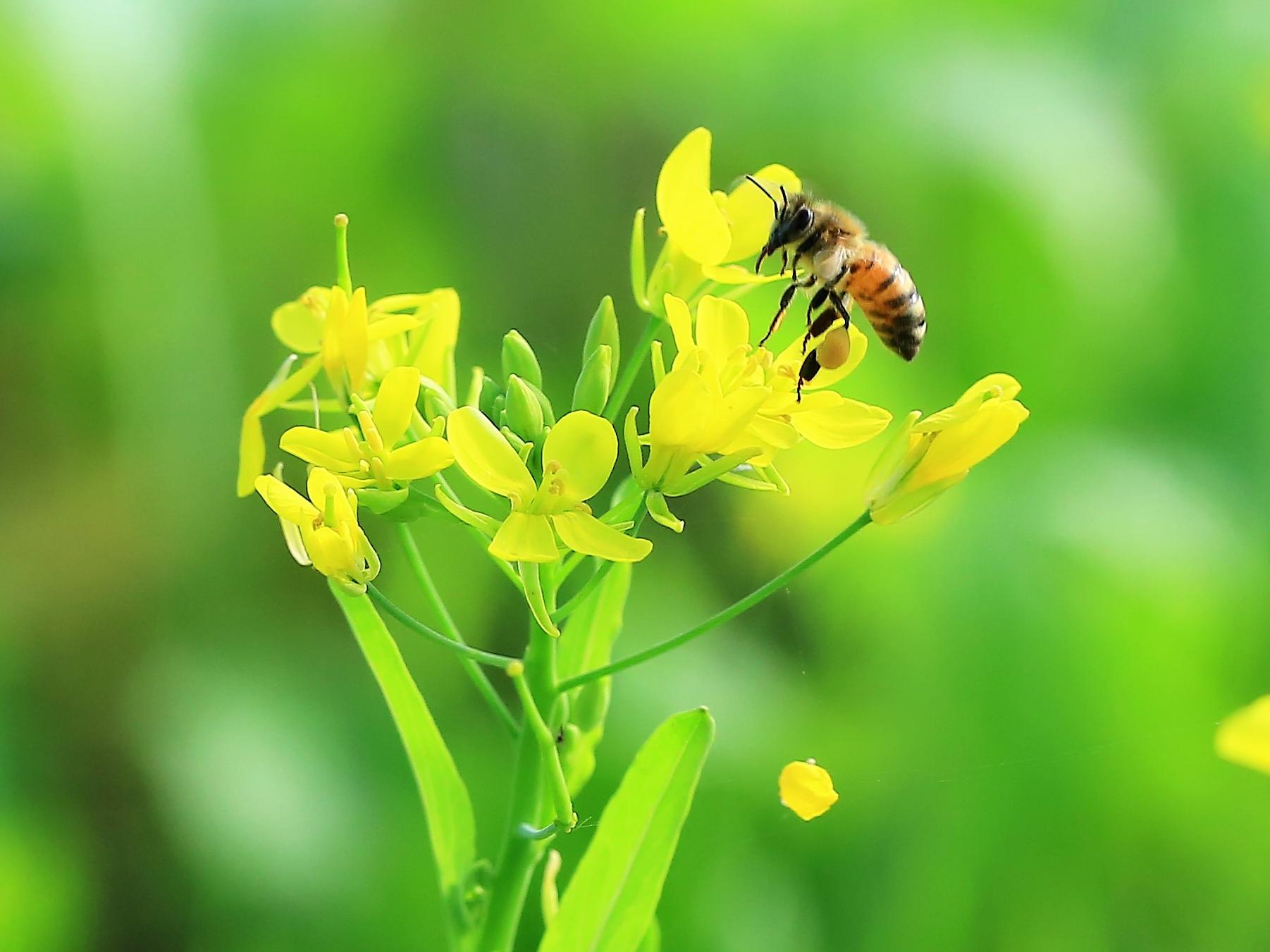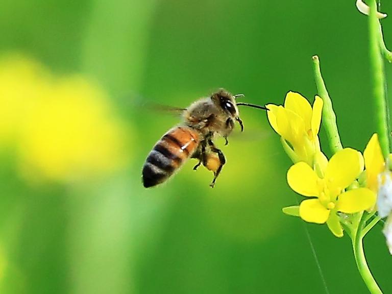 花東縱谷開花的油菜花田,蜜蜂大爆發,蜜蜂都是靠頭上那對敏銳的觸角找到花,再用前、中、後足刷花粉,把花粉蒐集到花匣裡,形成團狀,載回蜂巢。 -