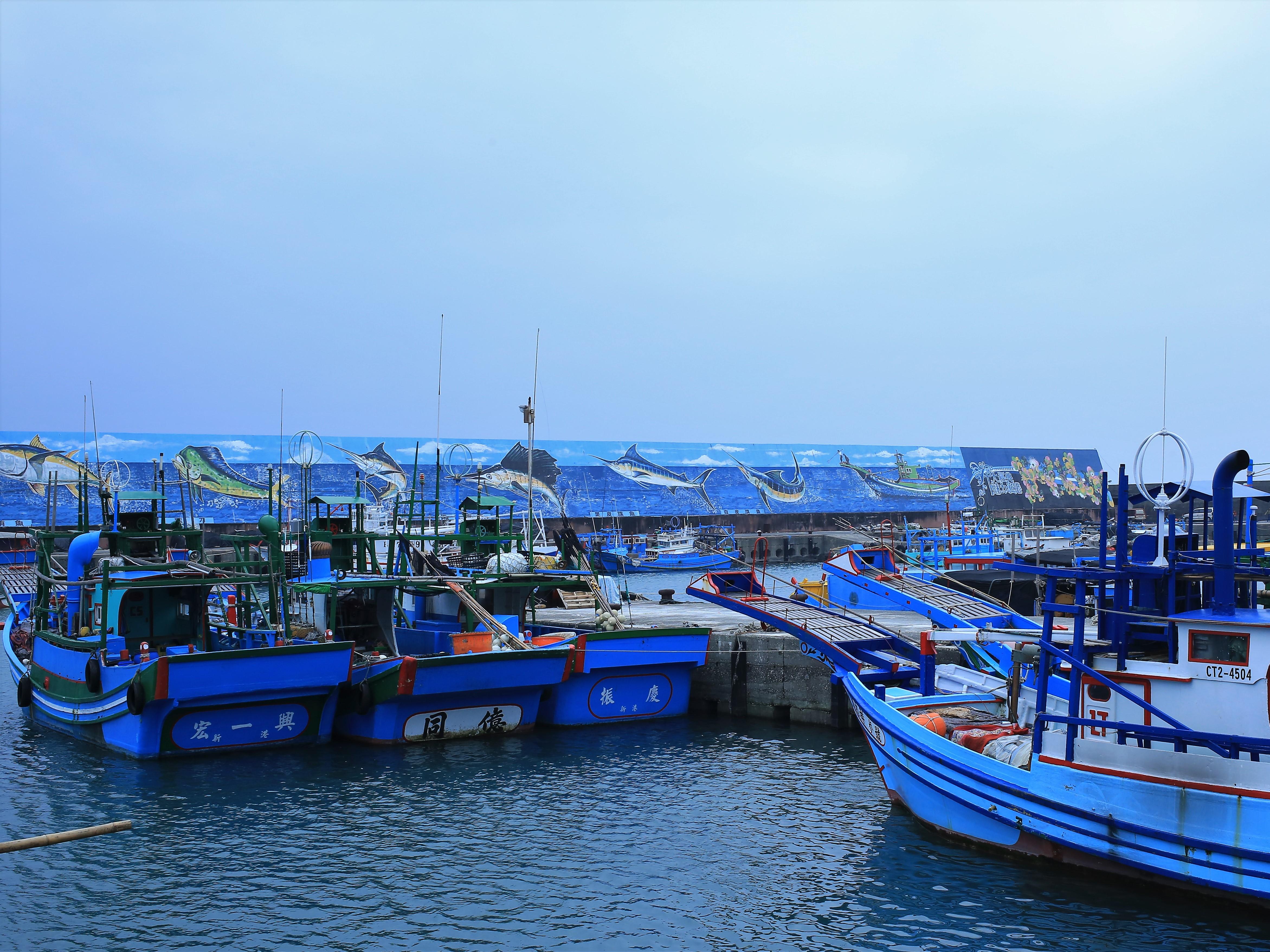 台東新港漁港鏢捕旗魚船都停在同一碼頭。 -