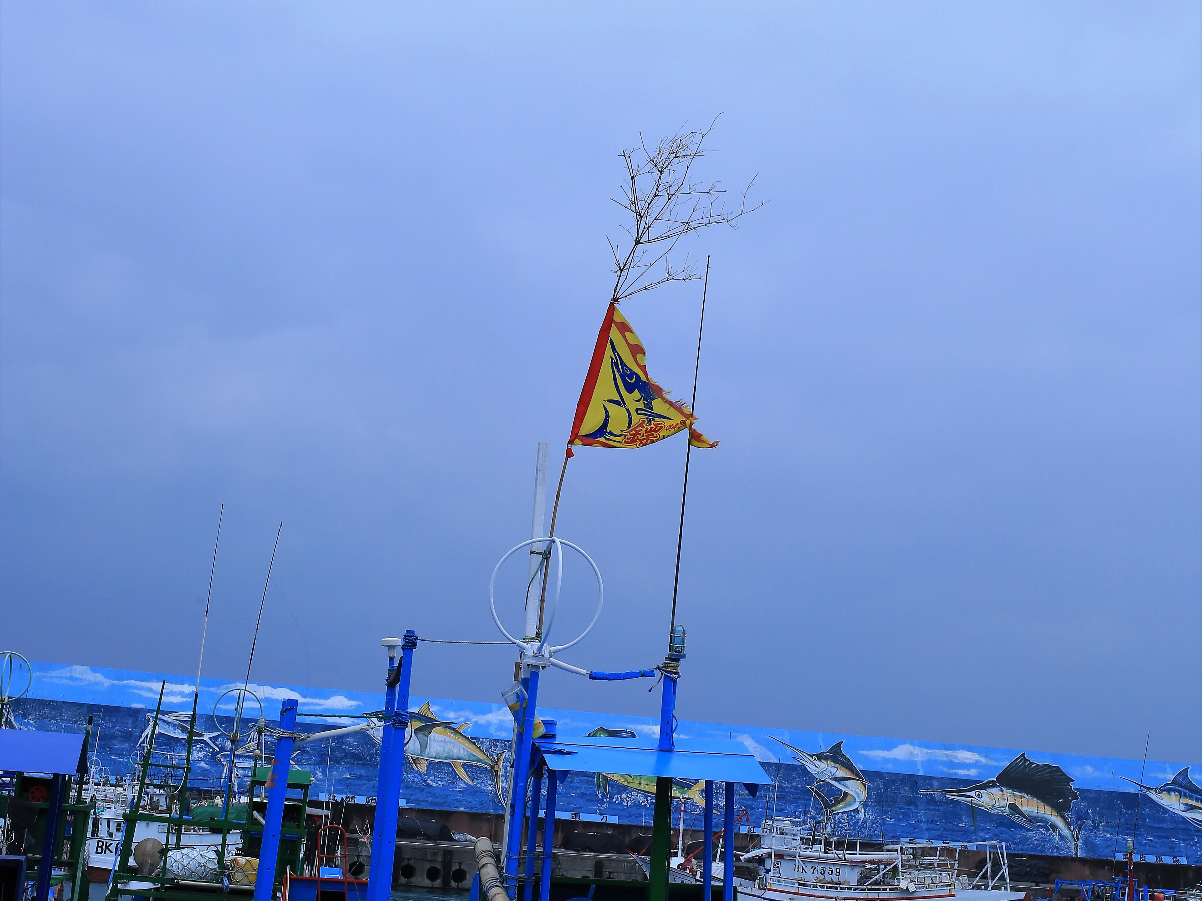 台東新港今年鏢捕旗魚船參加比賽,都掛有鏢字三魚旗。