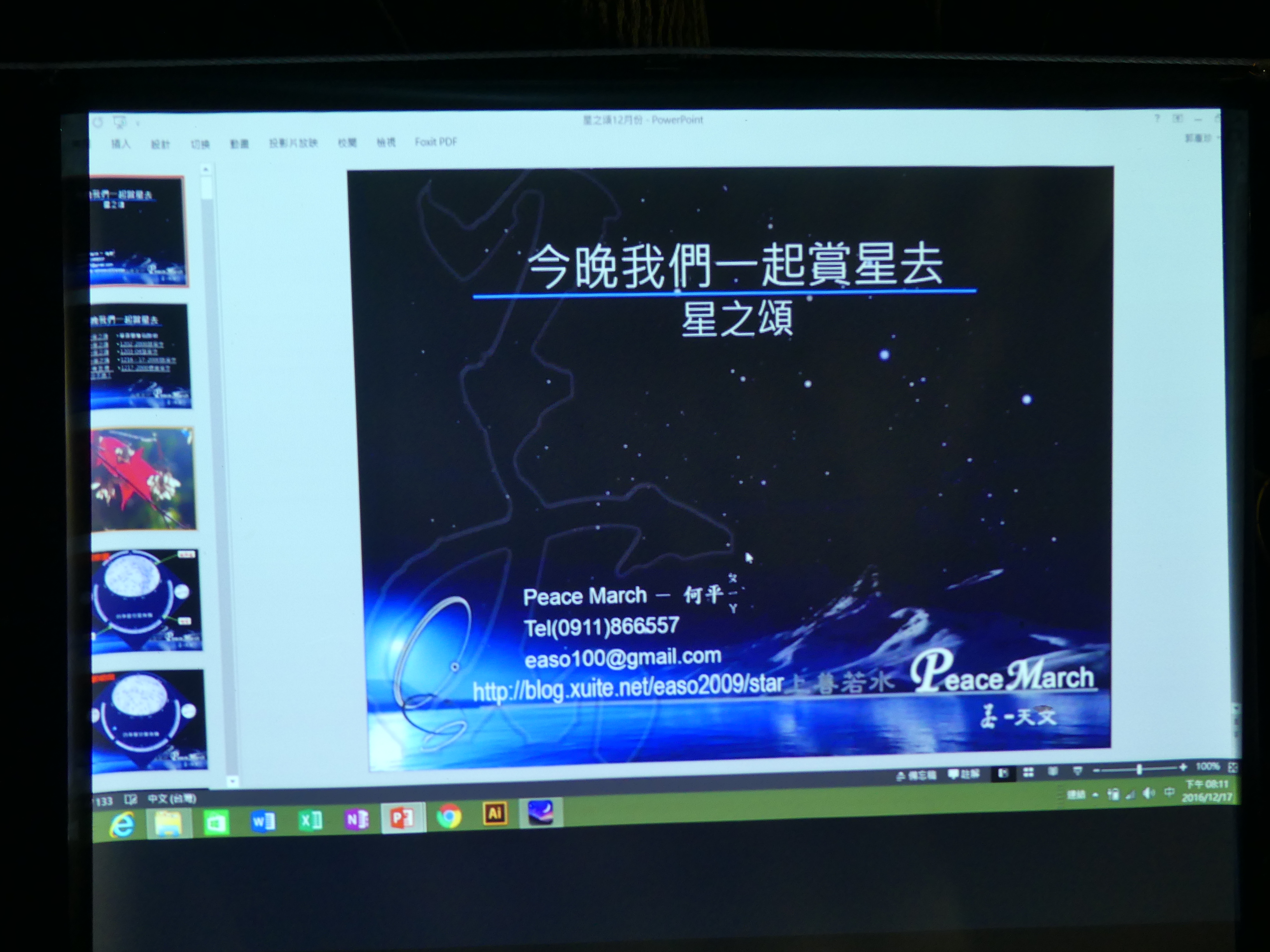 晚間八點到十點,受到何文吉老師的星空演講招喚,月亮和金星都出現了。在花東無光害沒汙染的的情況下觀星,再也找不到比他更好的條件。何老師在台東努力耕耘十年培訓星空講師,成效呈現,台東已經成立了協會。