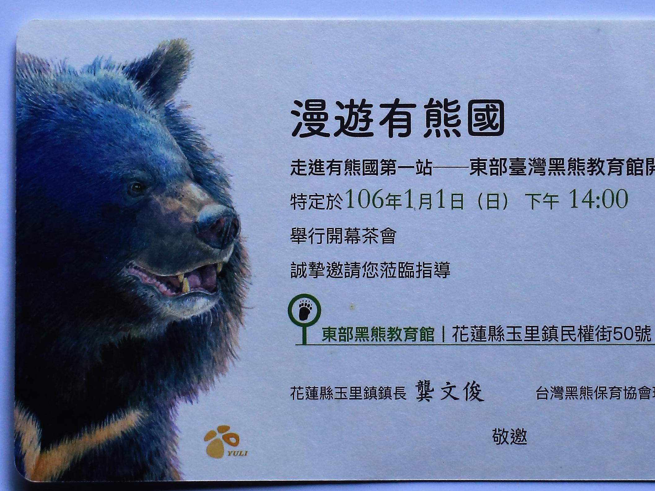 黑熊教育館請柬內容的意思是,玉里鎮是走進有熊國的第一站,所以設立黑熊教育館。其實花東縱谷東邊海岸山脈,有證據顯示,民國60年代以前,那裡曾是台灣黑熊棲地。