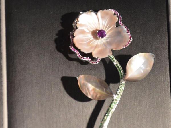 《微笑向我》胸針 材質:0.90克拉無燒紅寶石、珠貝、沙弗萊石「我愛寫,但是更重要的是等你來閱讀。」
