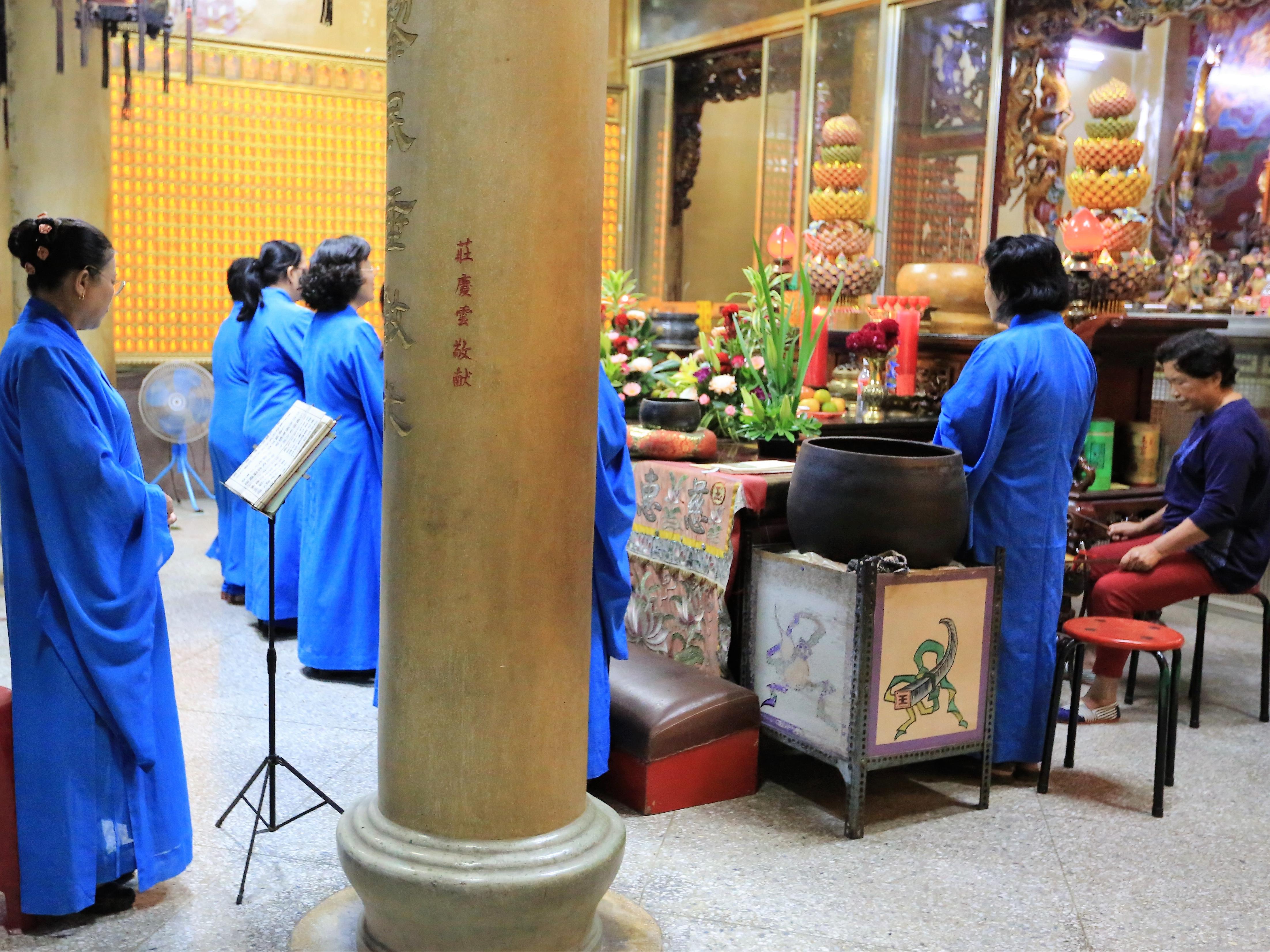慈惠堂廟婆說,誦經團誦的通常是地母經、觀音經,每週二,她們自主來廟誦唱天音,難以轉唱的誦唸原經文,可以轉成樂音用唱的,就以黃梅調的調子唱出,這群志工覺得這種專換很順、很搭。
