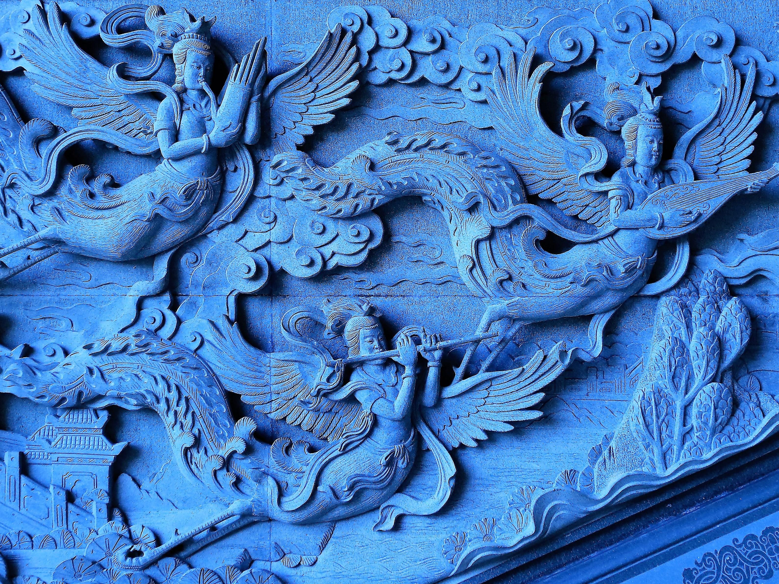 敦煌莫高窟有飛天壁畫,吹奏的就是天音,台灣仿製的浮雕,充斥在廟的裝飾上。