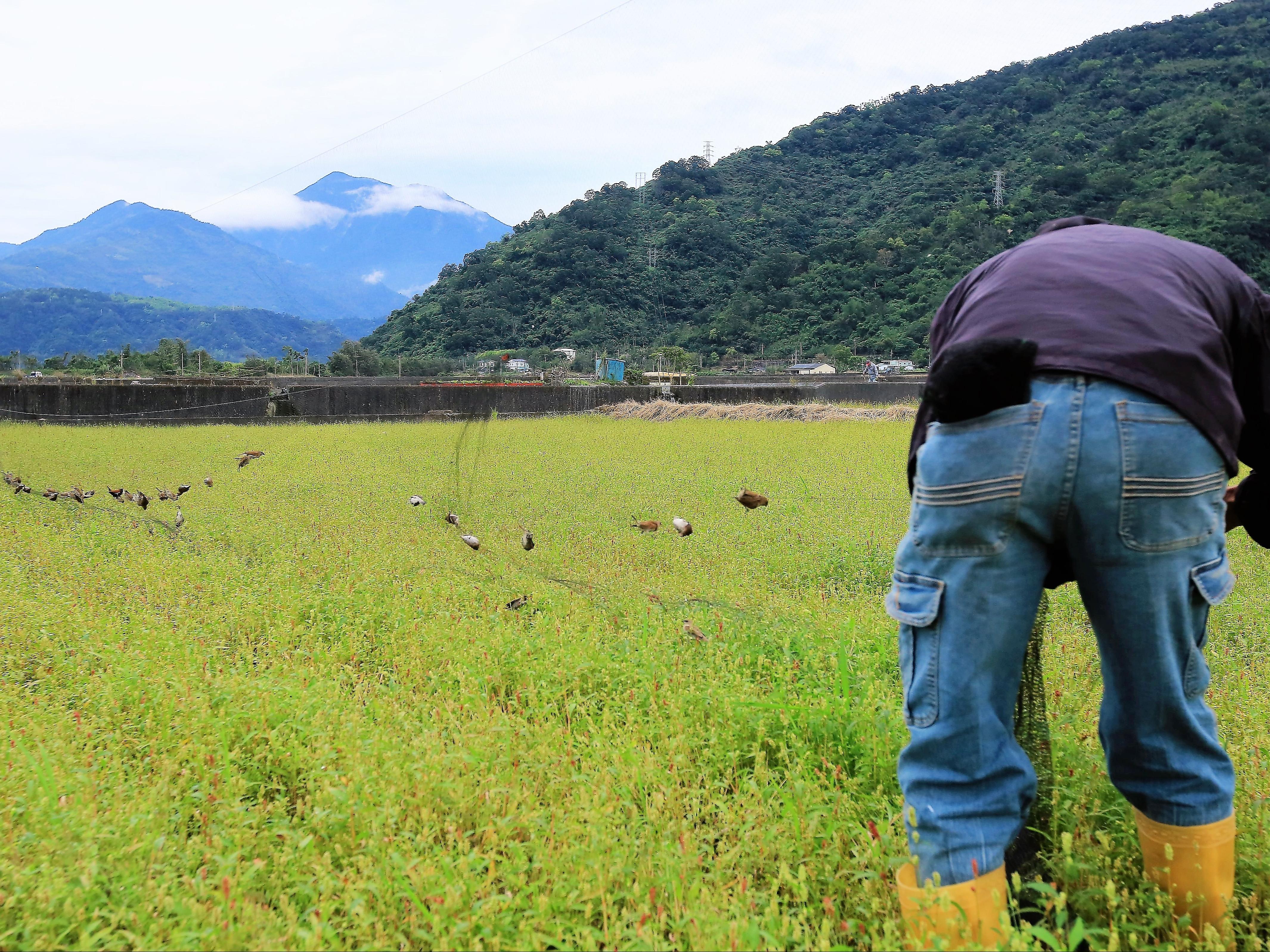 花蓮縣玉里鎮有好幾個,第二期稻作收割後一個月,專在稻田裡架網捕捉這種斑文鳥的人。這段時間,田裡長出一種滿田都是,會結整串種籽的草,引來一群群斑文鳥,捕鳥人追著鳥跑。一見鳥群,就在田間架網趕鳥,把整群的鳥趕往鳥網的方向;一群鳥飛過後,往往有好幾十隻掛網被捉。