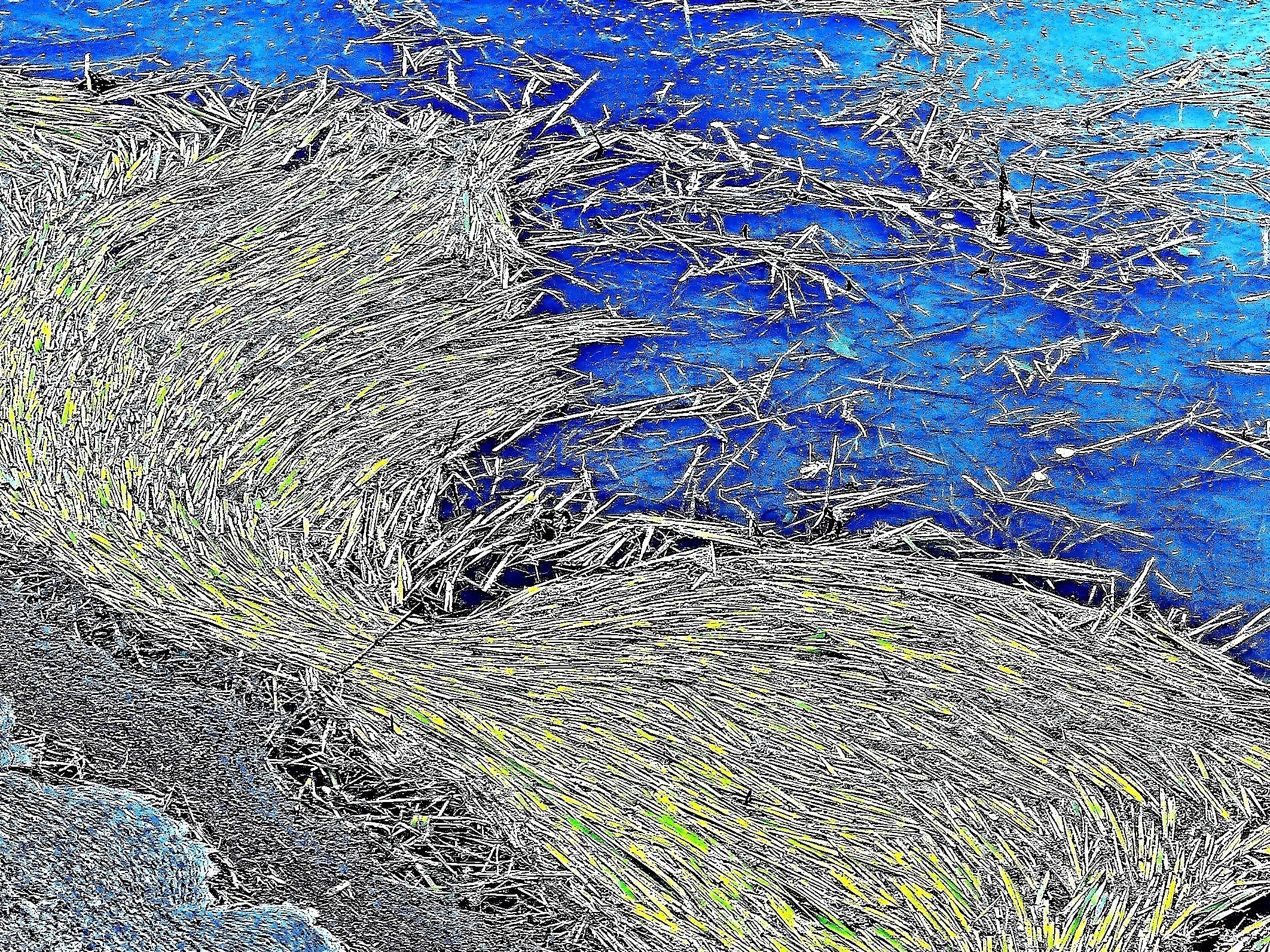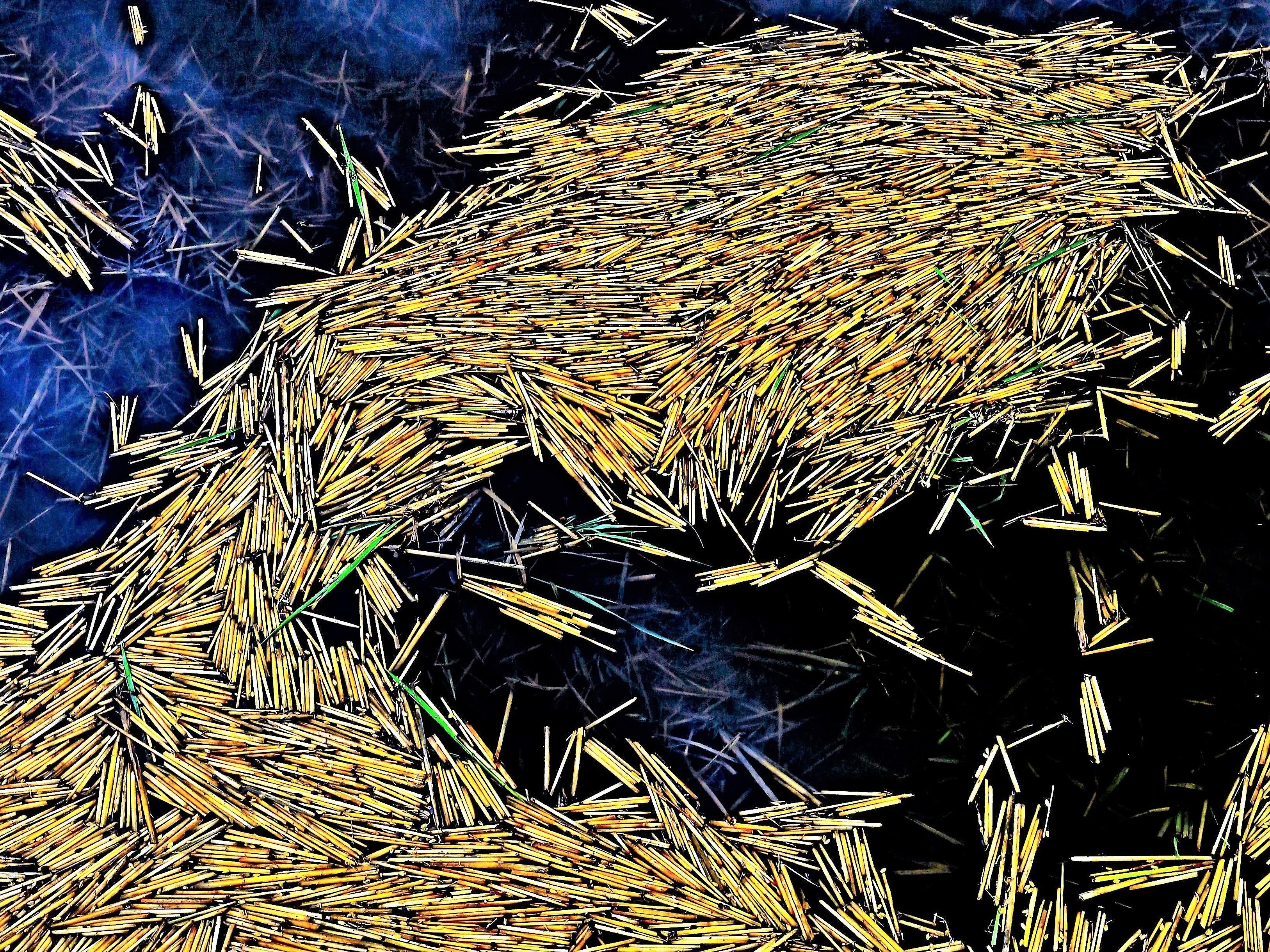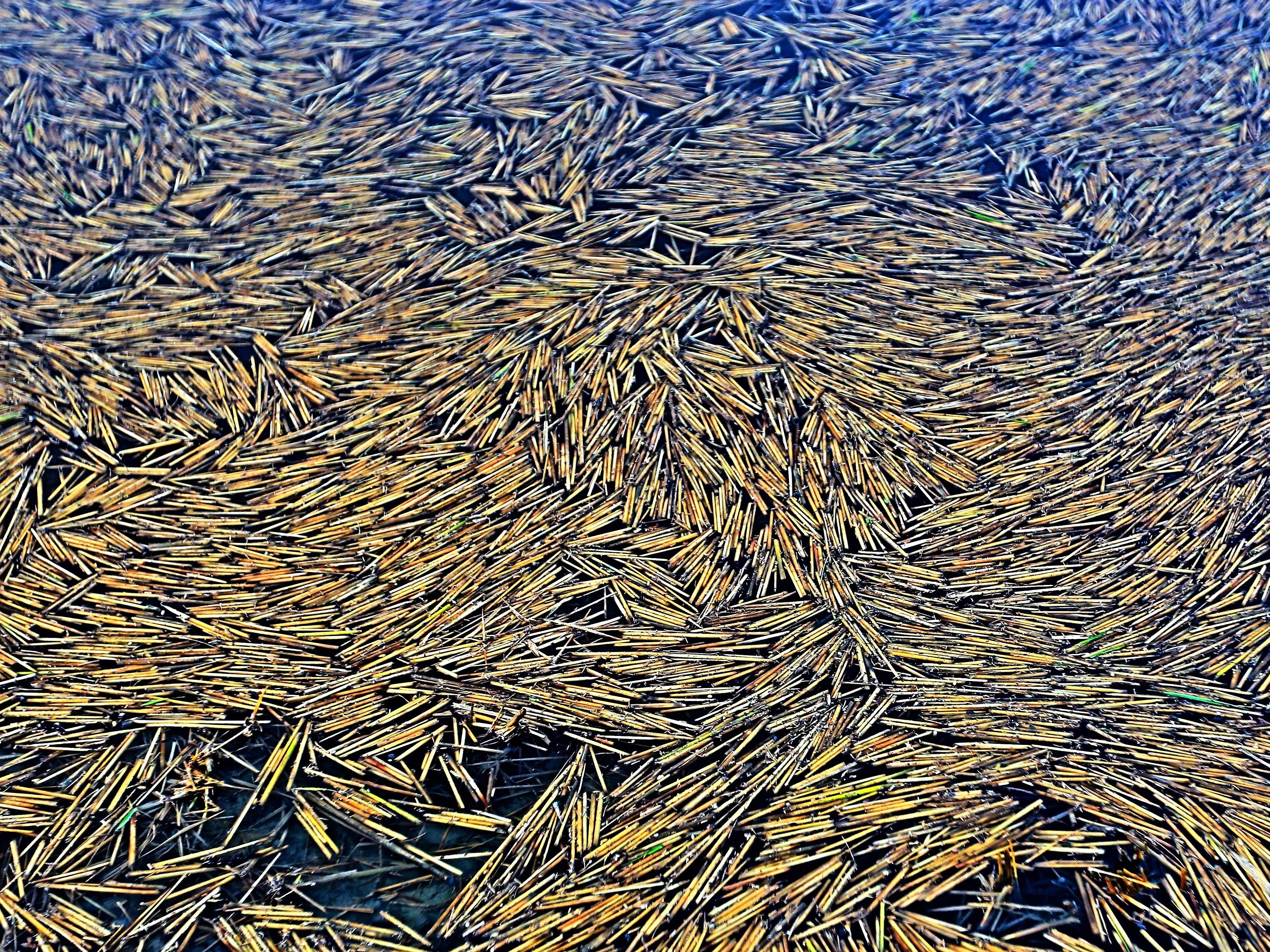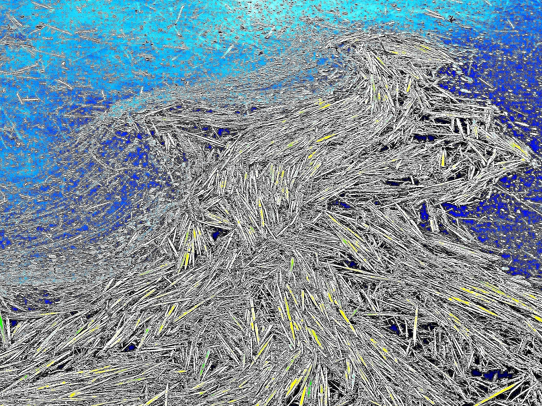 有這種差別,主要是秋耕是第一期稻作收割後,接著就翻耕插秧,田間的禾桿還沒長出再生稻苗;曳引機翻兩翻後,粗短禾桿浮起,在風的吹送,水的帶引下,完成各種相同風格,不同構圖的抽象畫作。這時禾桿偏黃,畫作看起來,像梵谷的筆觸和用色。