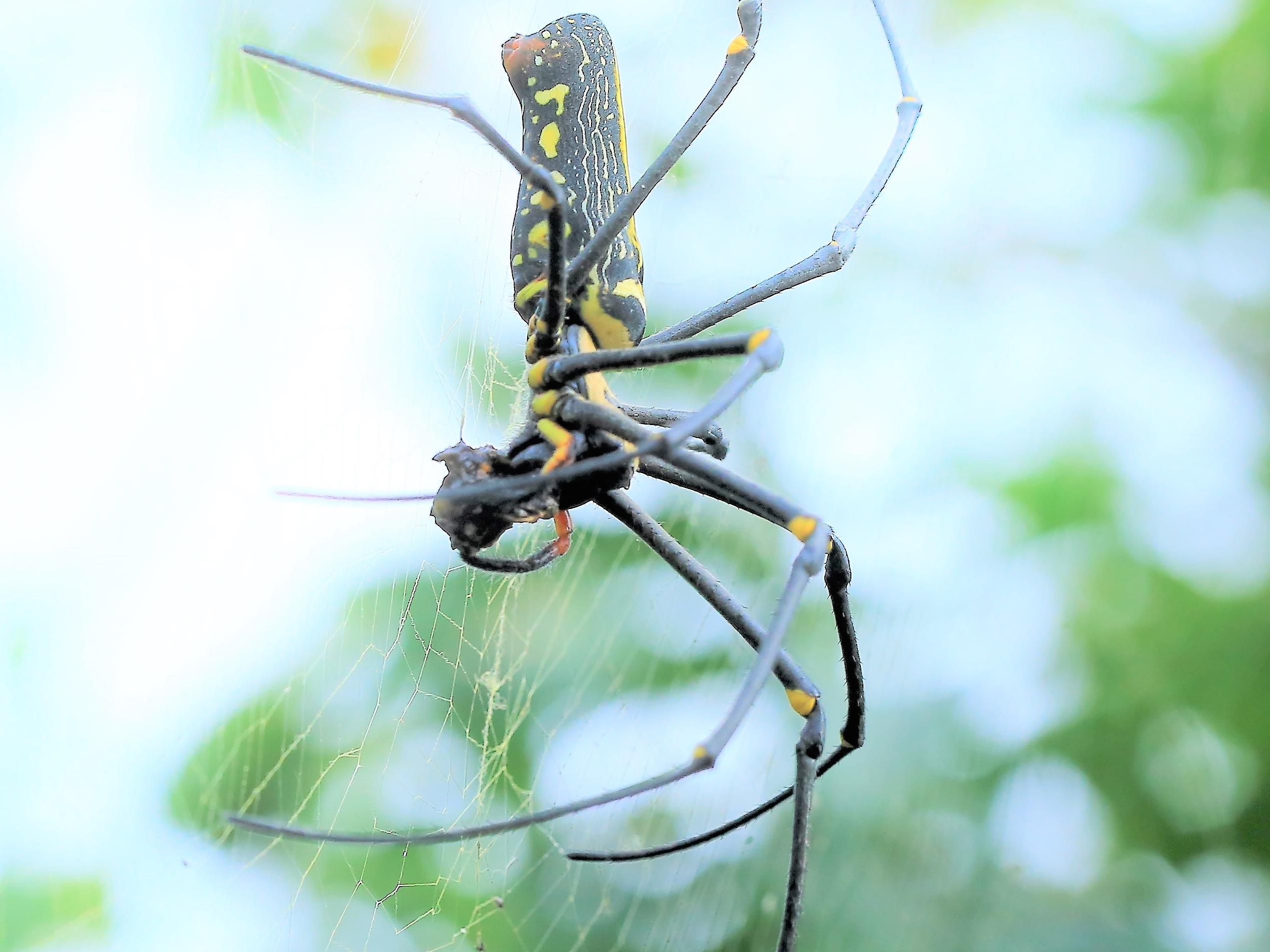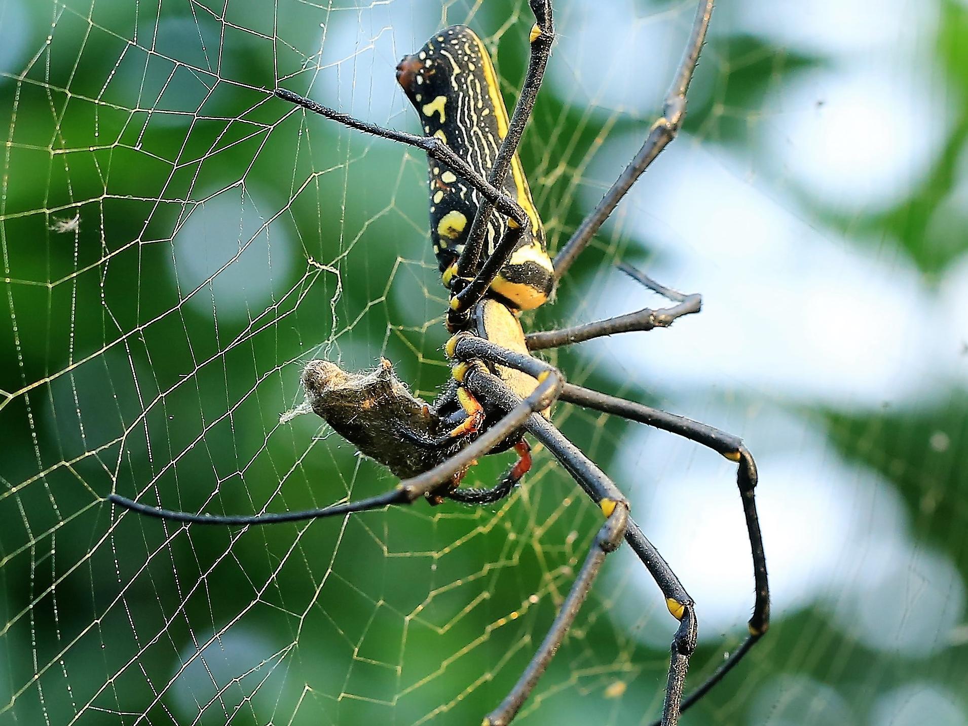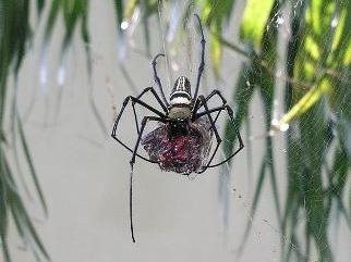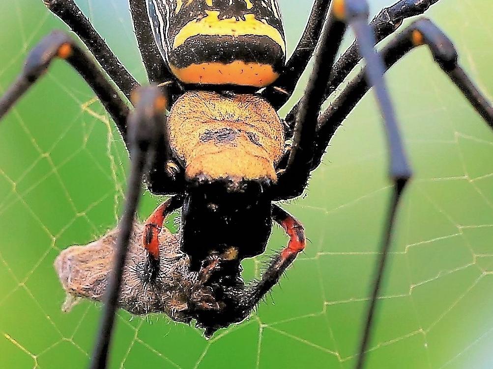 專家說,人面蜘蛛的網最大,最堅實,就是蝙蝠、蛇或小鳥如果誤闖,也逃不掉,最終就是成為人面蜘蛛的餐點。卓蘭實驗高中老師朱耀德,多年前任教國立玉里高中,就在校園裡拍到人面蜘蛛捕獲斑文鳥,把整隻斑文鳥吃光,連頭殼也無存。