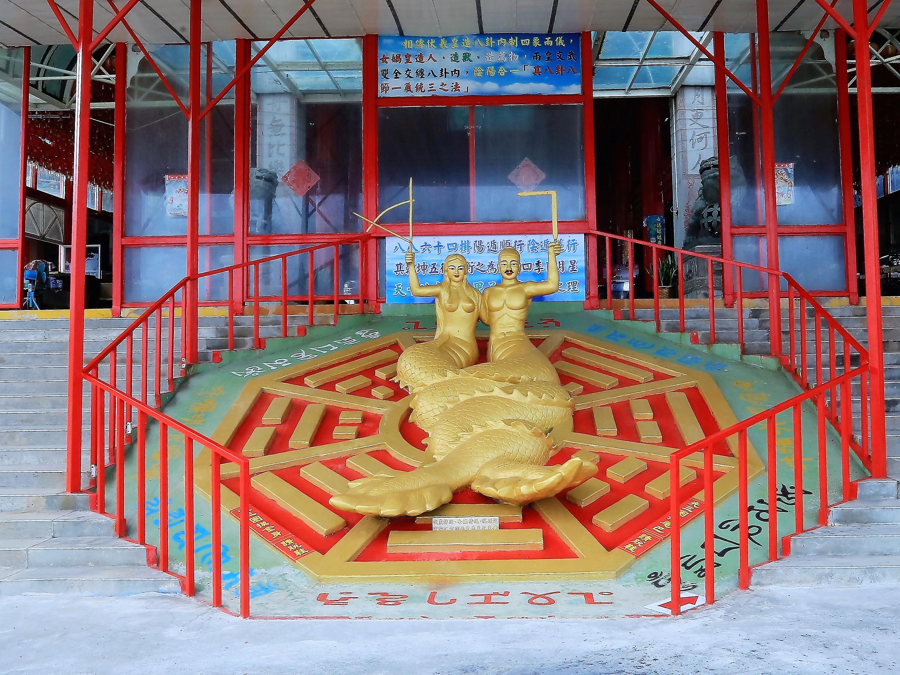 據了解,廟在一位補教界教英語的皮姓老師幫忙下,廟門上,除女媧娘娘廟華語外,還有英語、日語及羅馬併音,讓老外一看就知道這與愛情和婚姻有關的廟。但最奇特的是廟階上,有伏羲和女媧龍麟尾交纏在八掛上的塑像,廟方說,遶這八掛塑像一圈,想戀男女可以永浴愛河,婚姻難偕合的,遶過後會百年好合。
