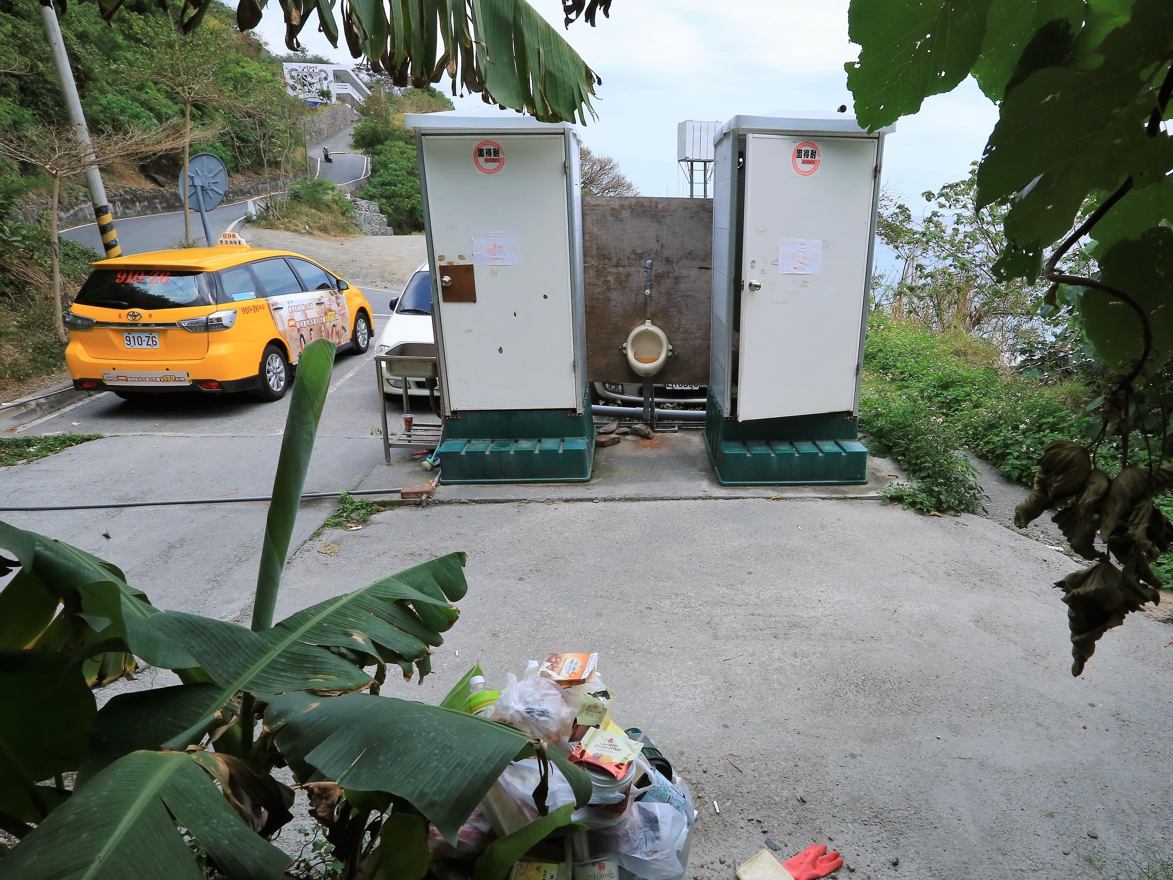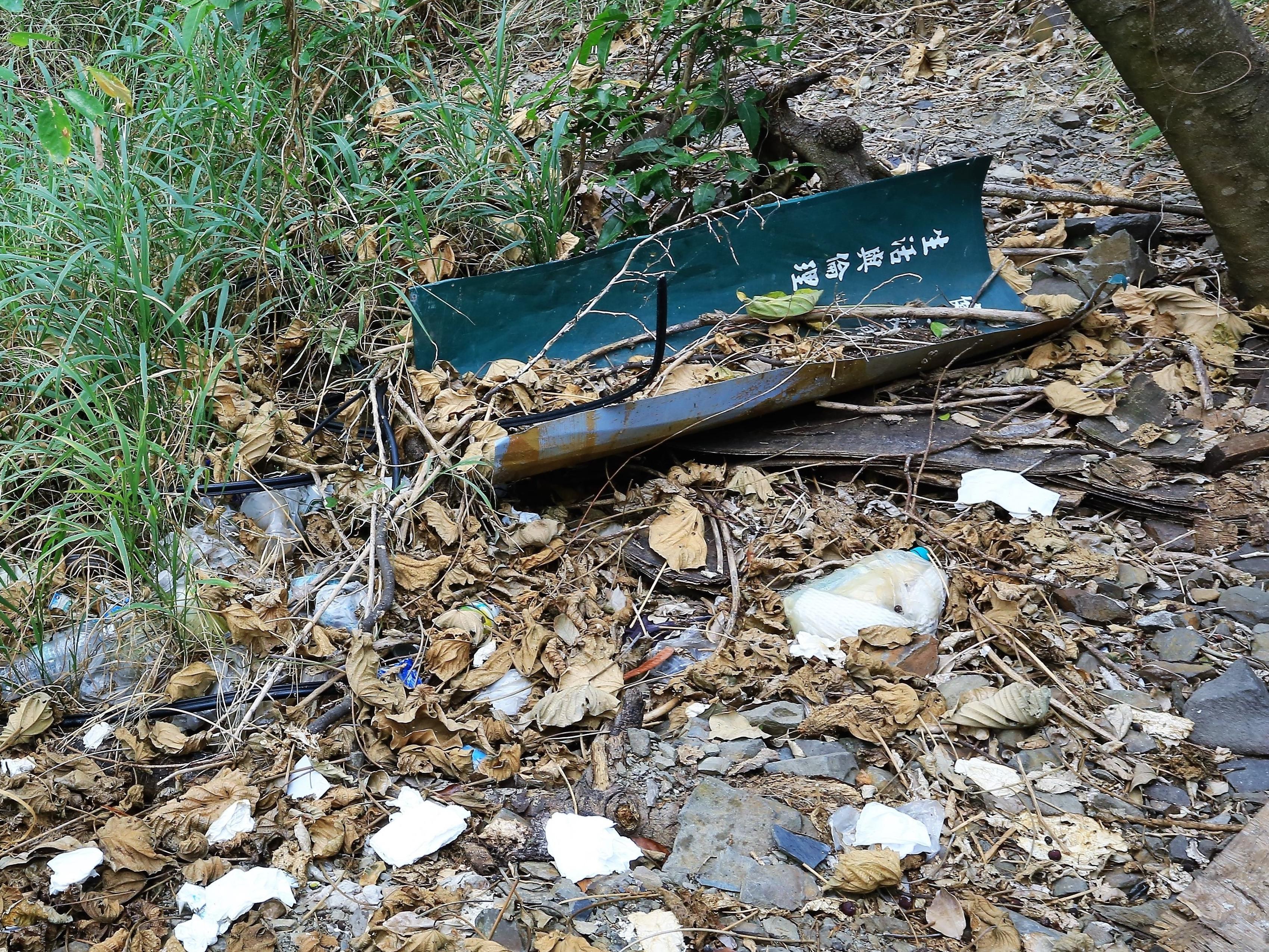 那兩間簡易廁所不止「哀愁」到不能使用,連看都不能看,沒有人敢進去;對膀胱快爆炸的旅客,只好跑到廁所後方的樹林裡解放,於是樹林裡,到處是有礙眼睛健康的垃圾,一塊不曉得何時被丟棄,寫著「生活與倫理」的牌子,在垃圾中露出來,是在諷刺這些在非廁所便溺的觀光人嗎?