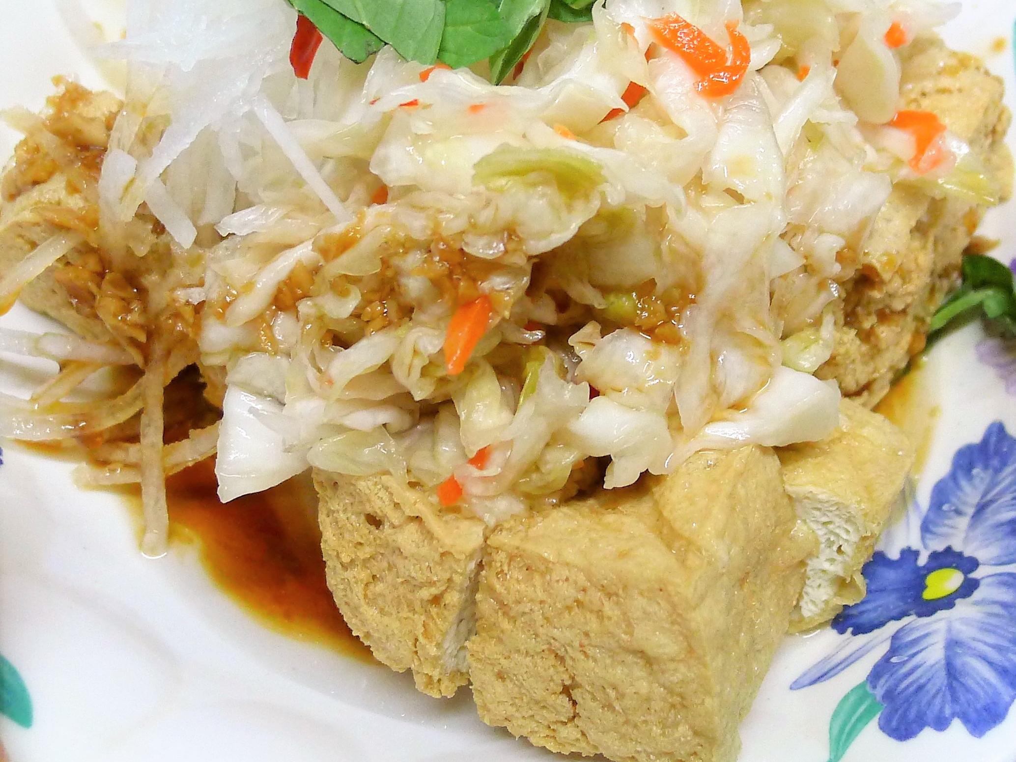 臭豆腐搭高麗泡菜、蘿蔔絲和九層塔吃才棒。 -