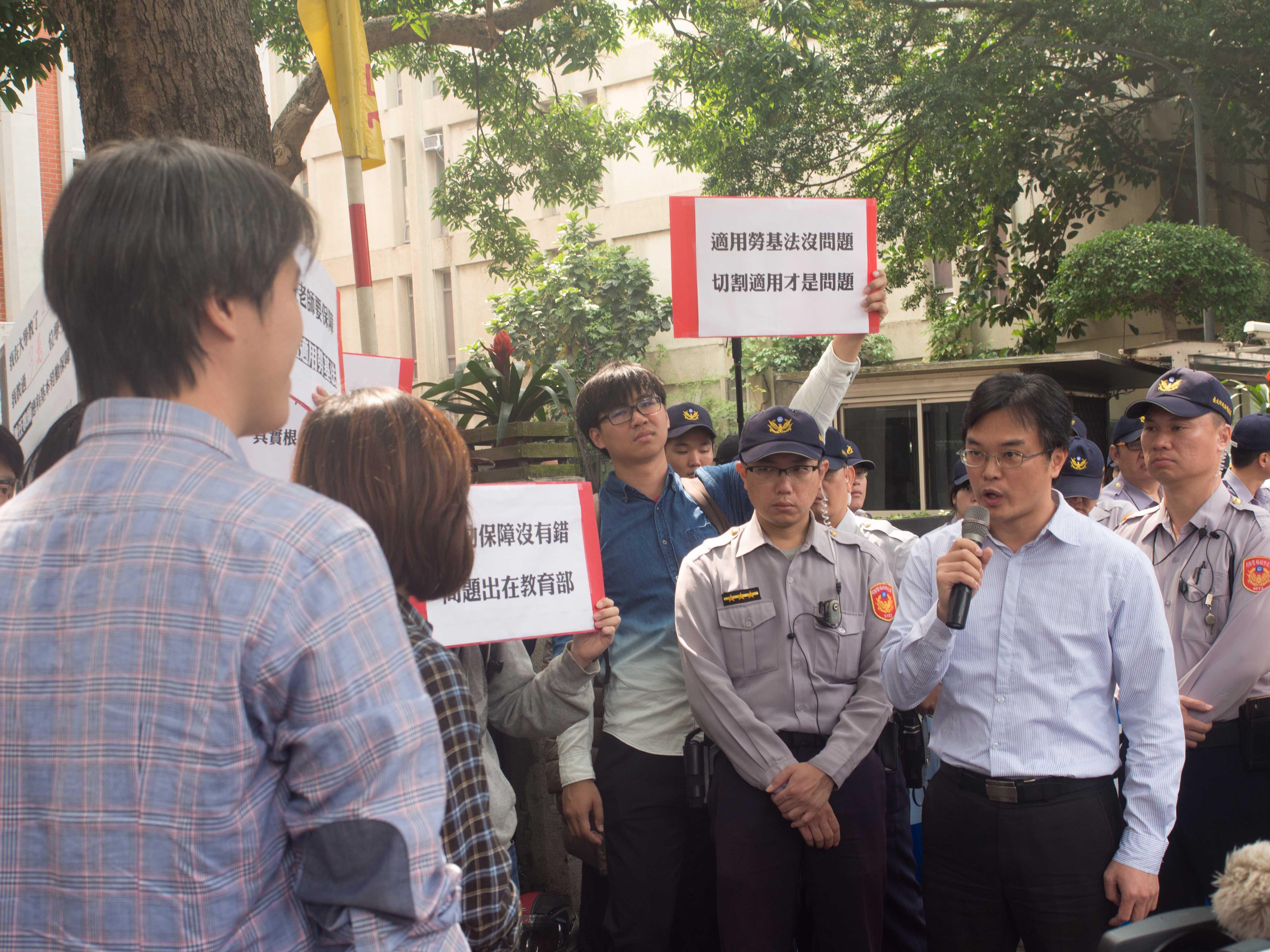 「目前兼任教師適用勞基法一事各界仍無共識」,出面接受陳情的曾逸群說,校園與一般勞動場域不同,教育部將依教師法授權修訂的兼任教師聘任辦法來維護他們的權益,並將在下周邀請包括高教工會的團體參加會議,修訂的辦法將送立法院備查並於8月1日上路。